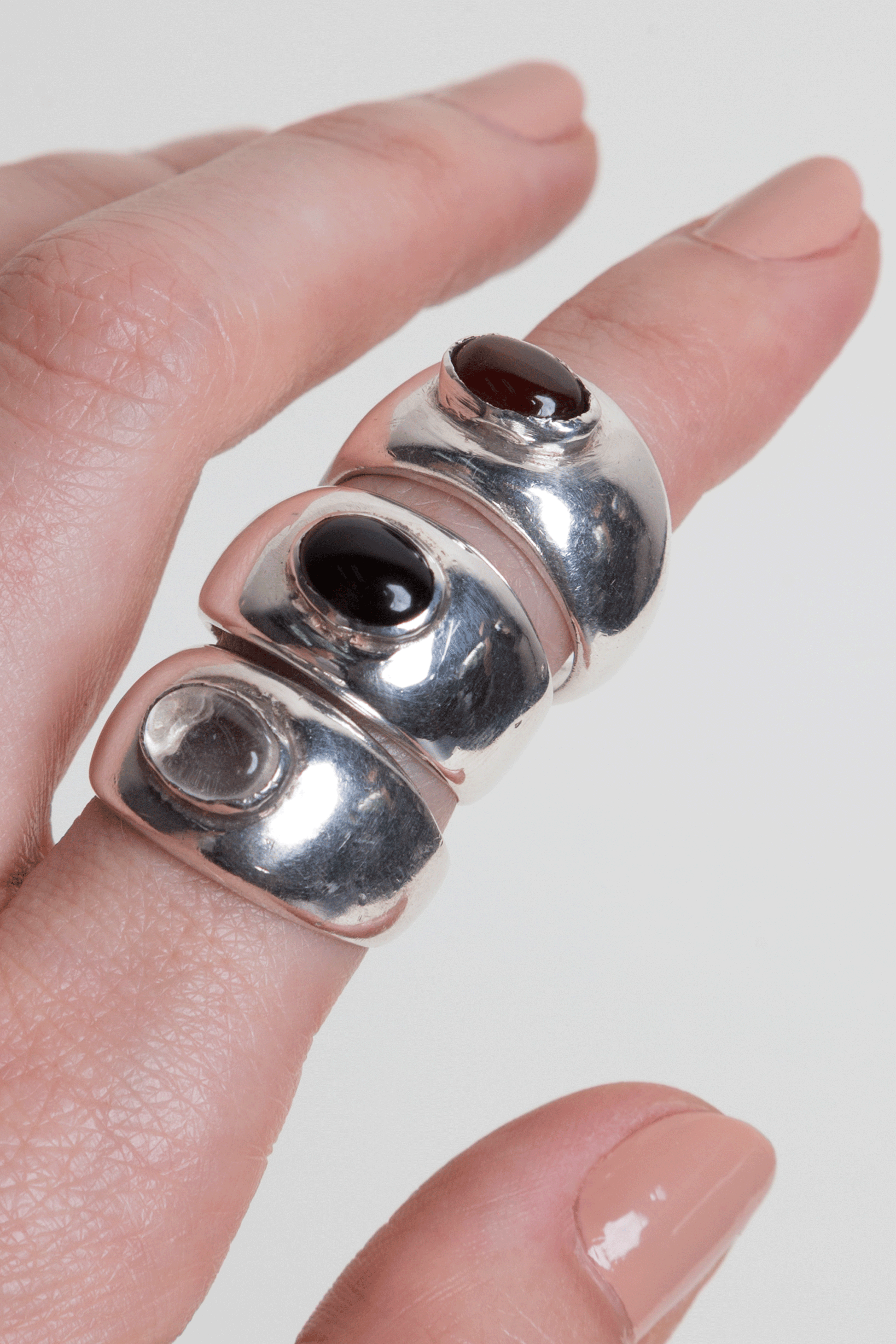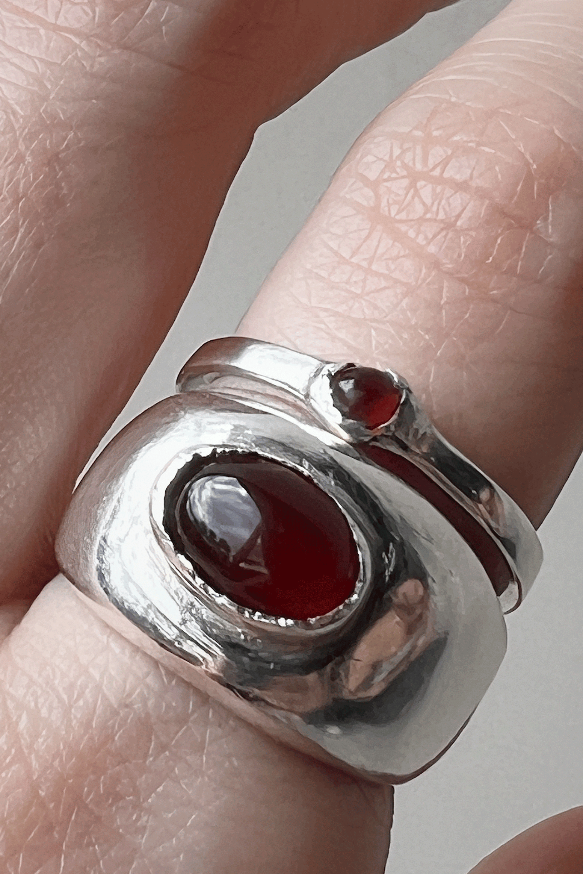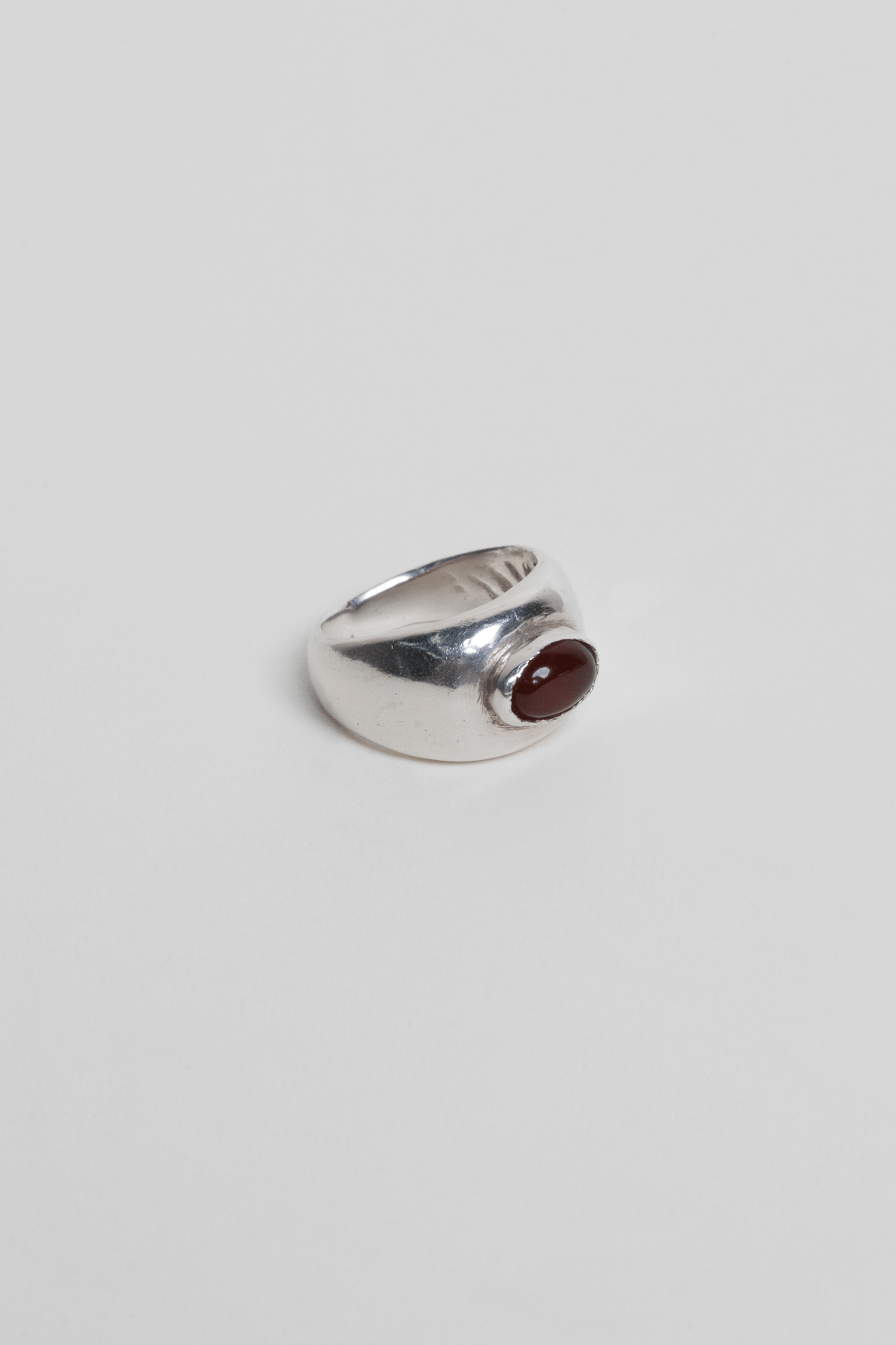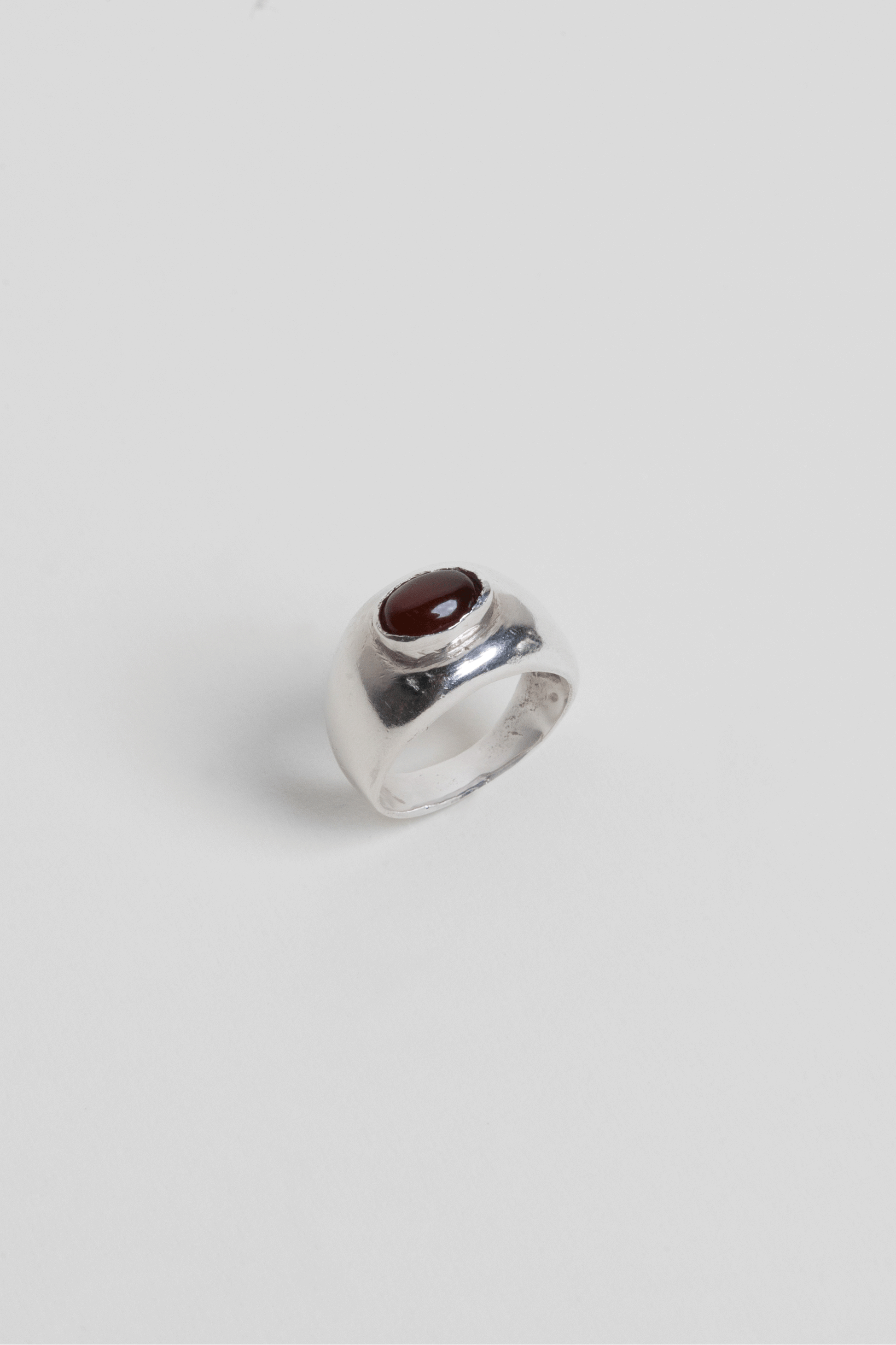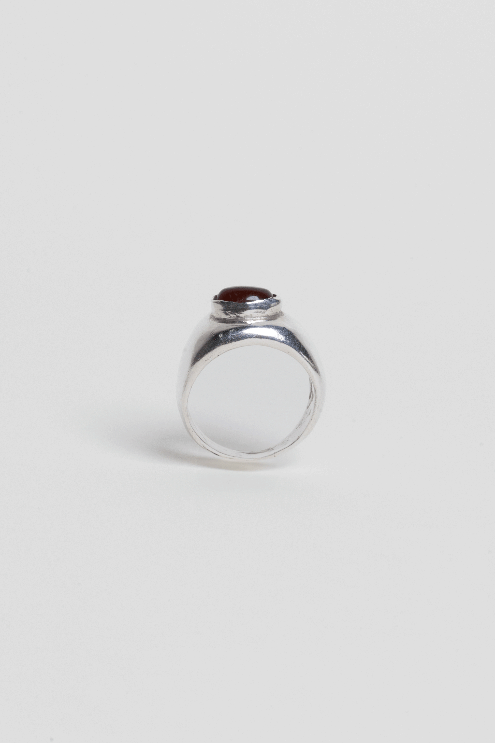 - Anillo grueso, uniforme y liso hecho en plata ley 950 con una cornalina (piedra roja) ovalada engastada en el centro.