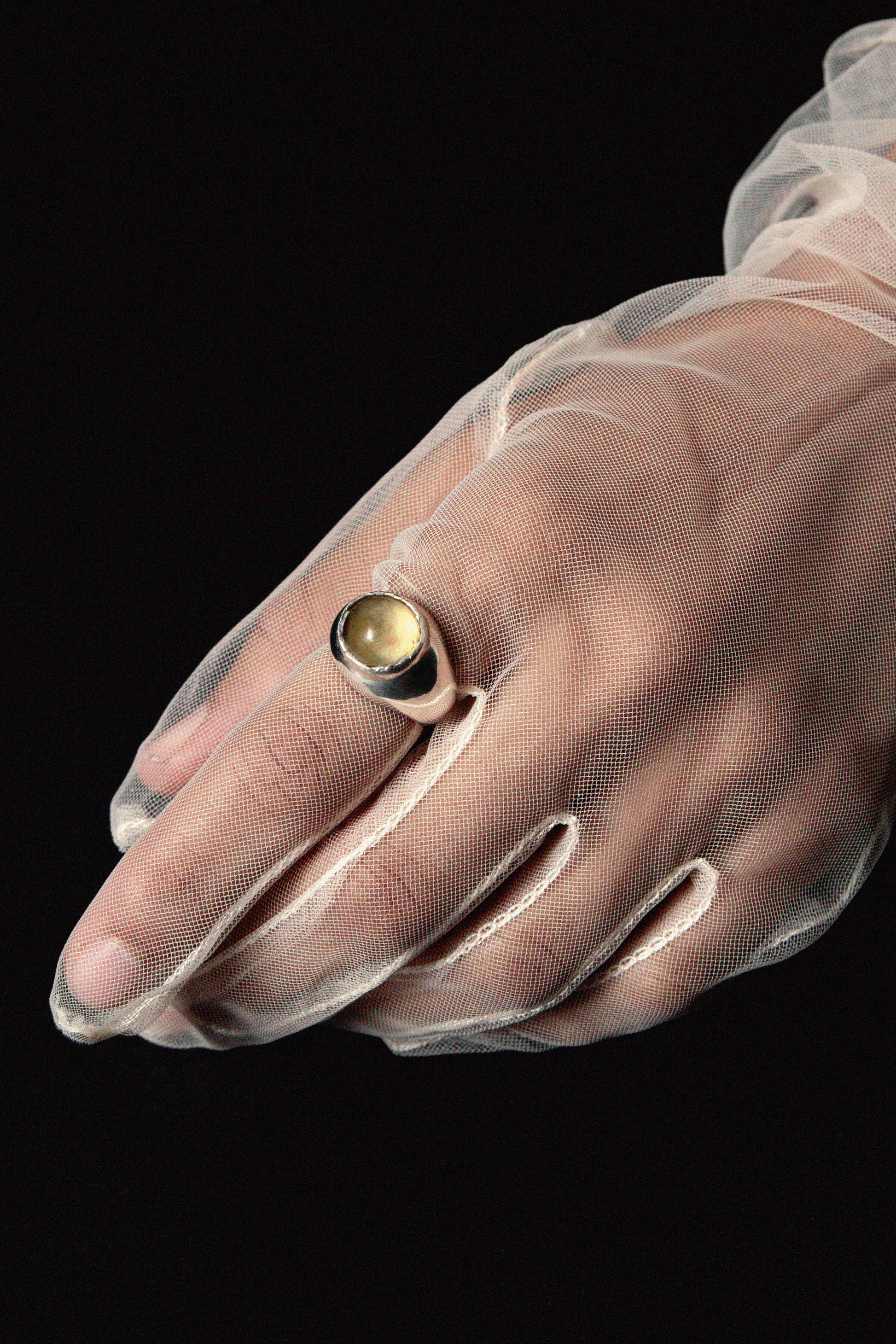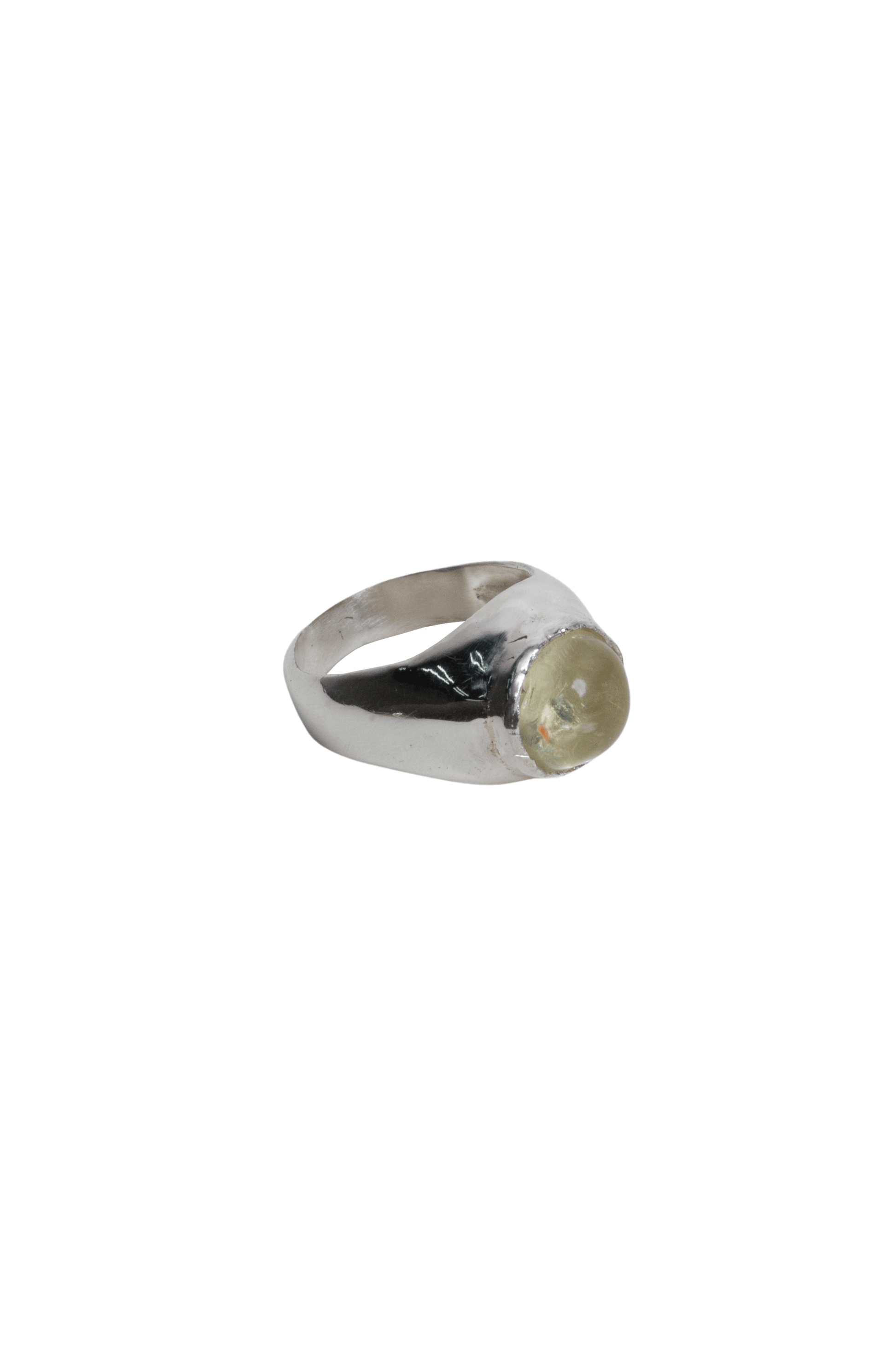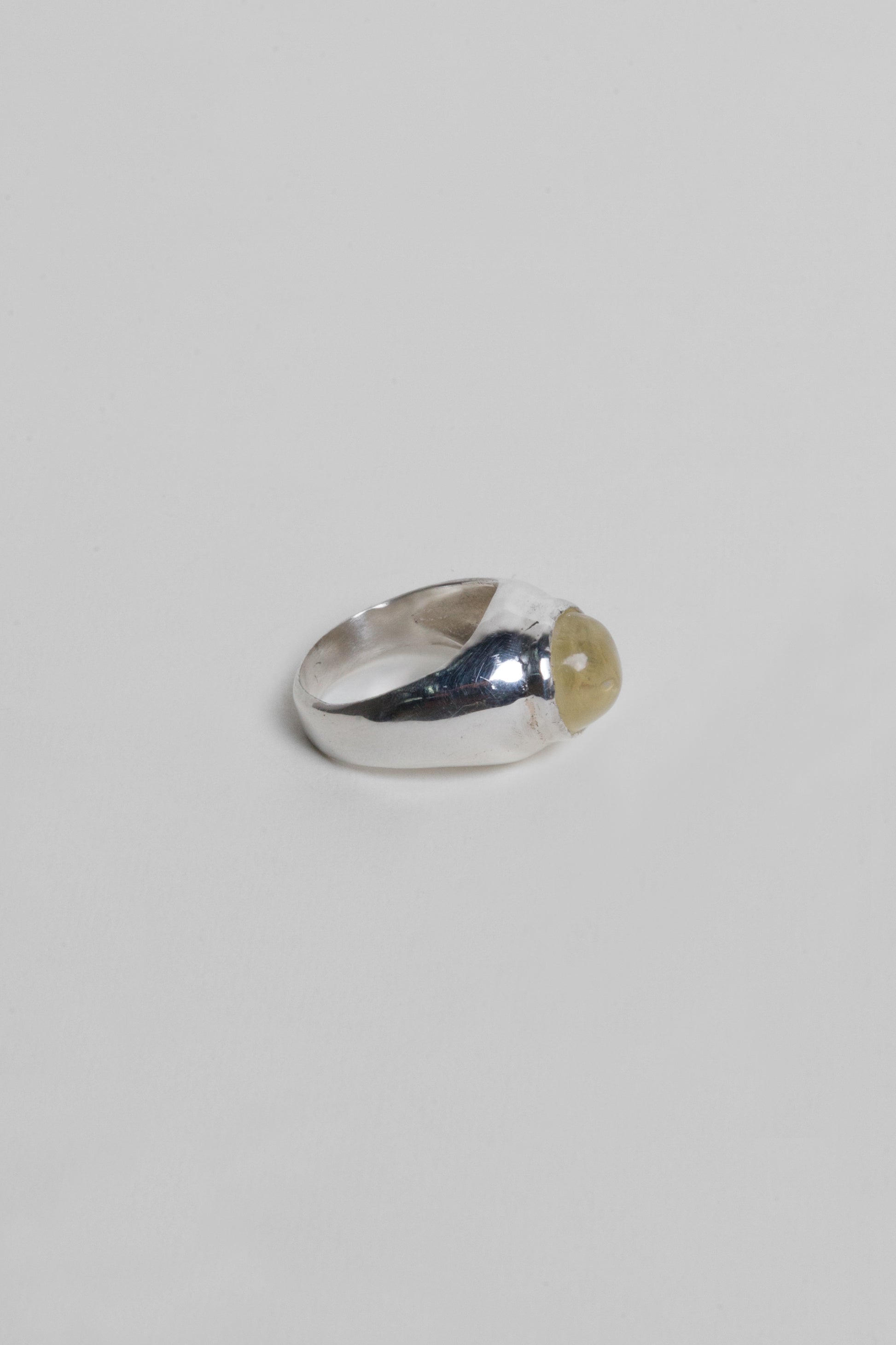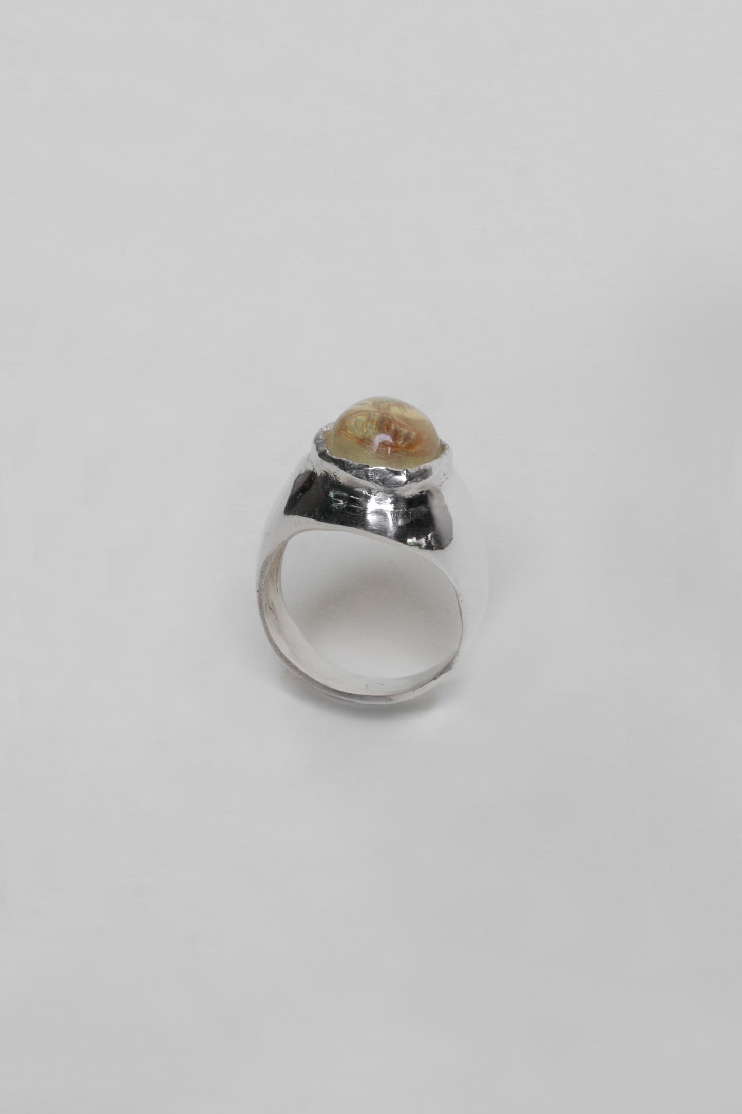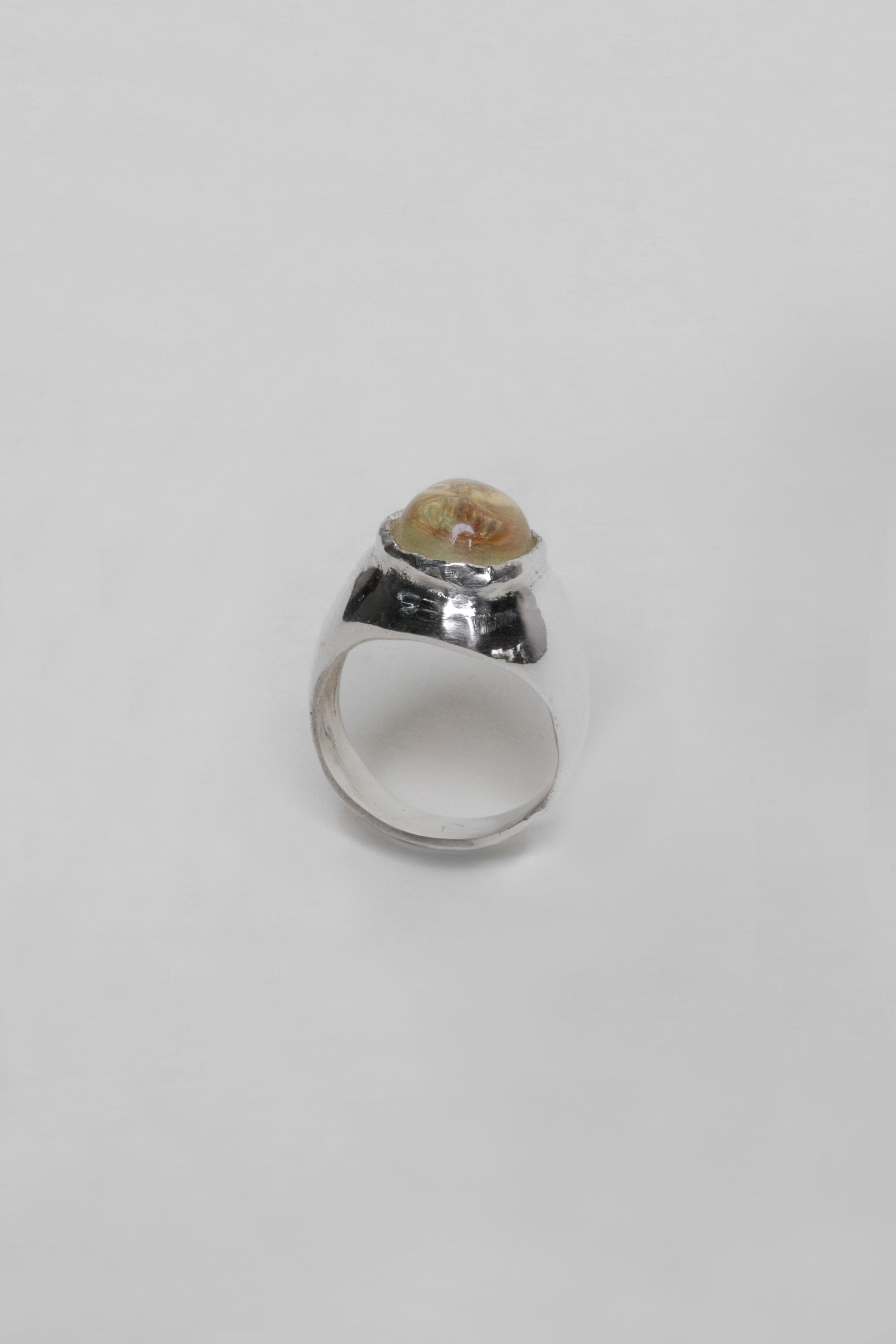 - Anillo ancho y liso hecho en plata ley 950 con un copal (ámbar más joven) circular tallado manualmente en el centro.