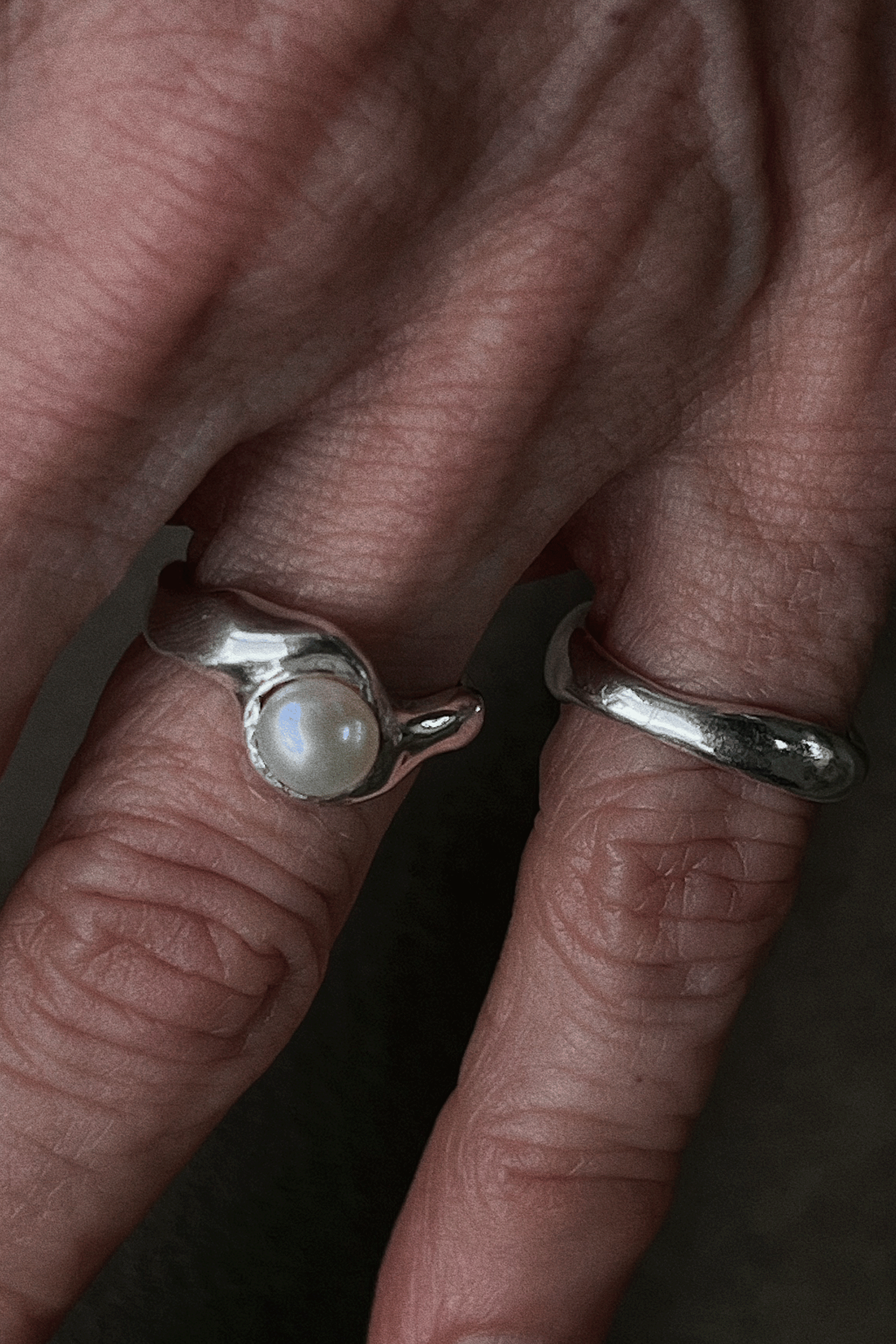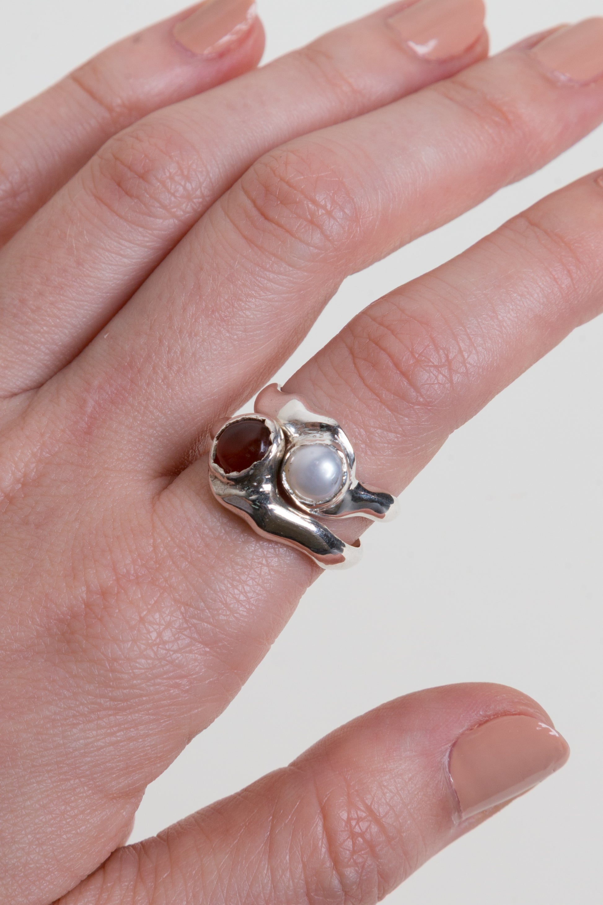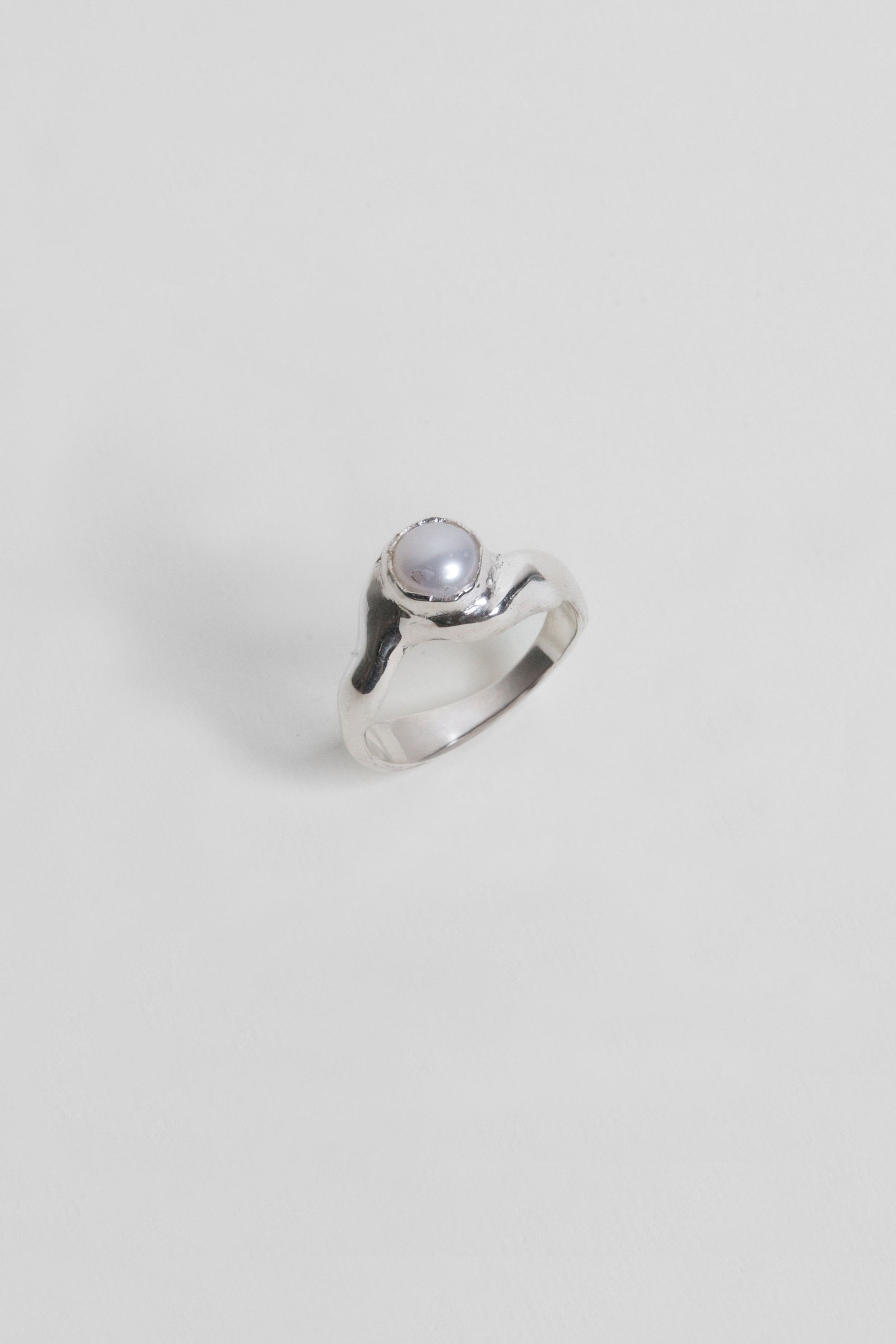 - Anillo irregular/ondeante hecho en plata ley 950 con una perla natural circular engastada en el centro.