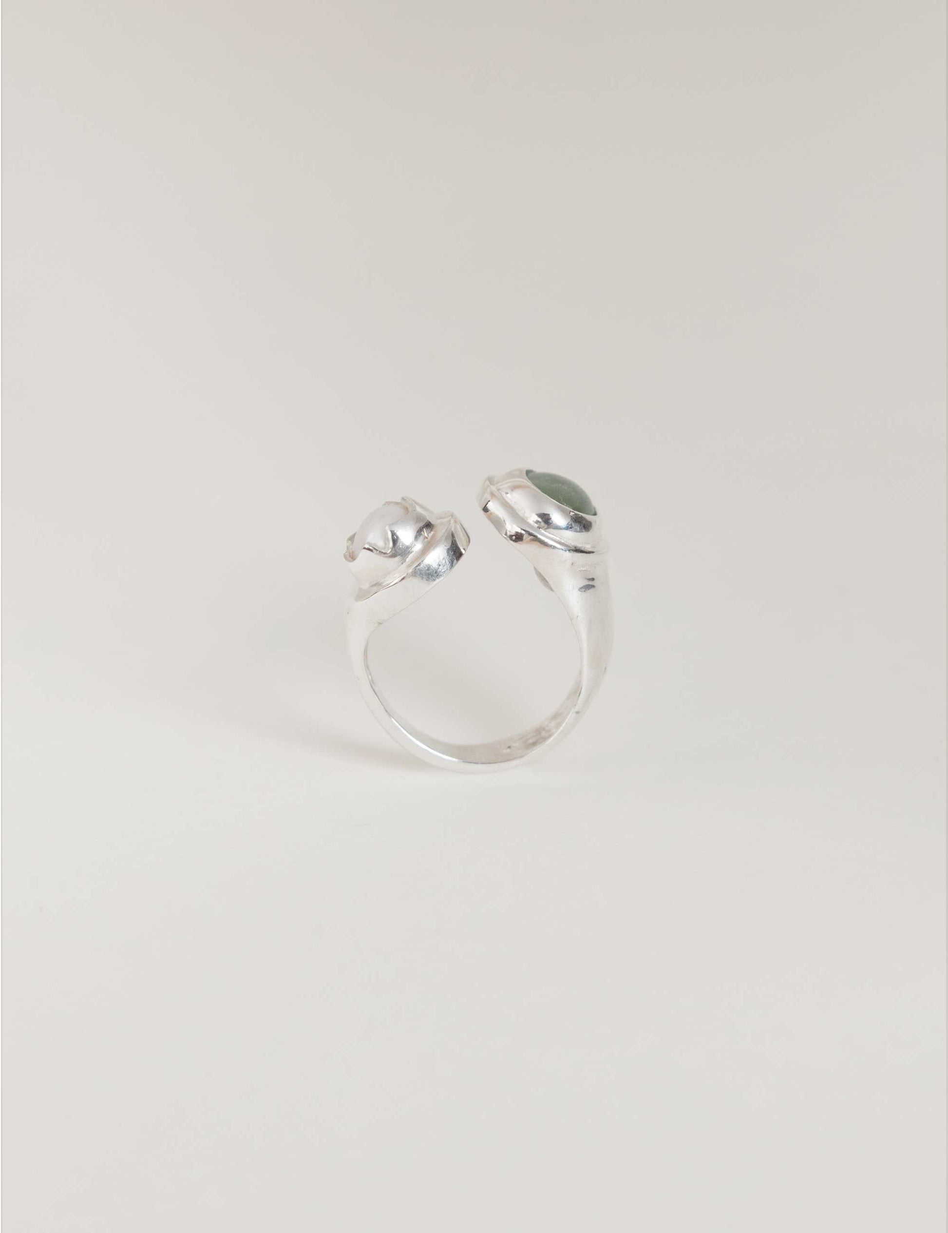 - Anillo liso hecho en plata ley 950 con una crisoprasa ovalada y una perla natural redonda engastadas en diferentes terminaciones del anillo.