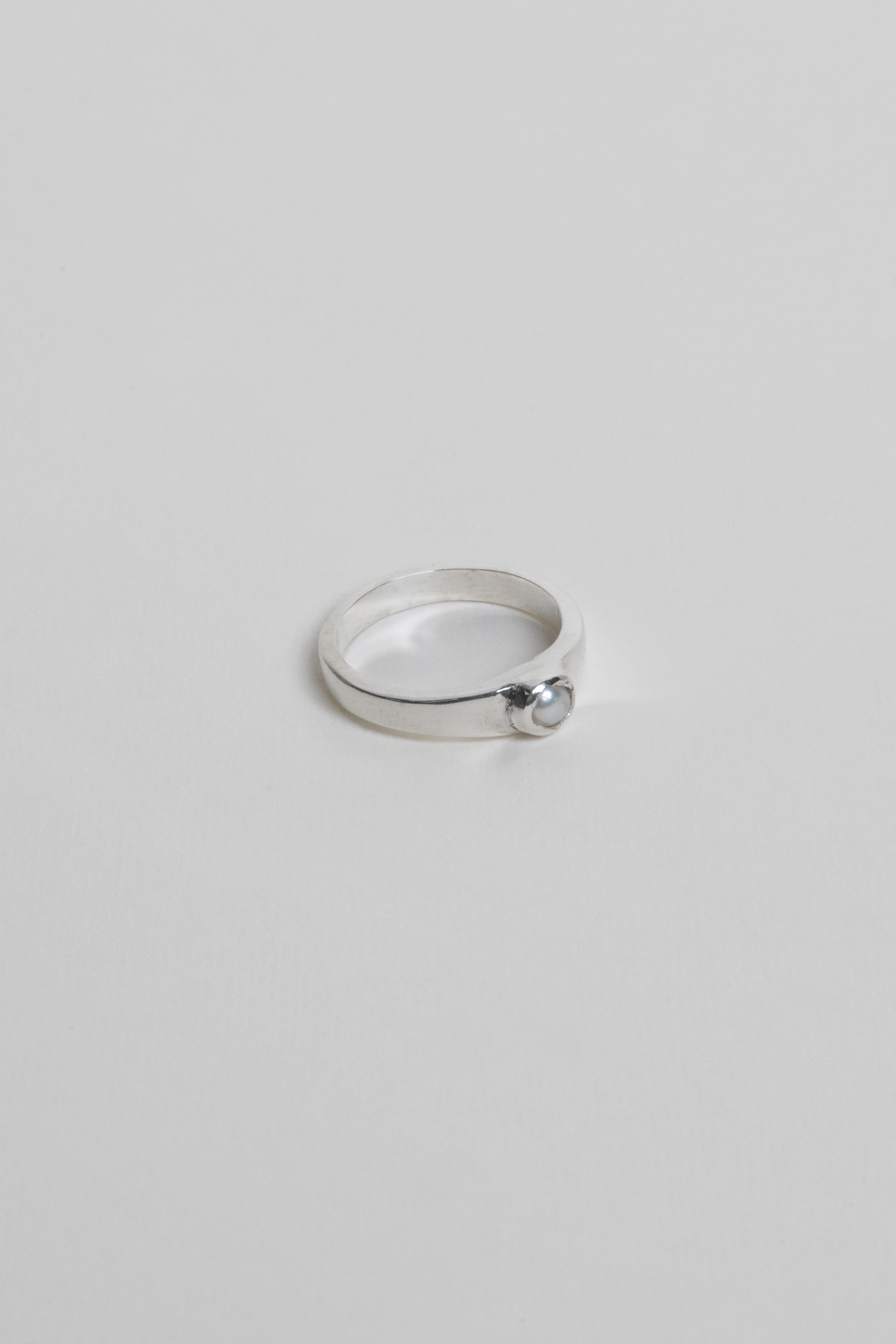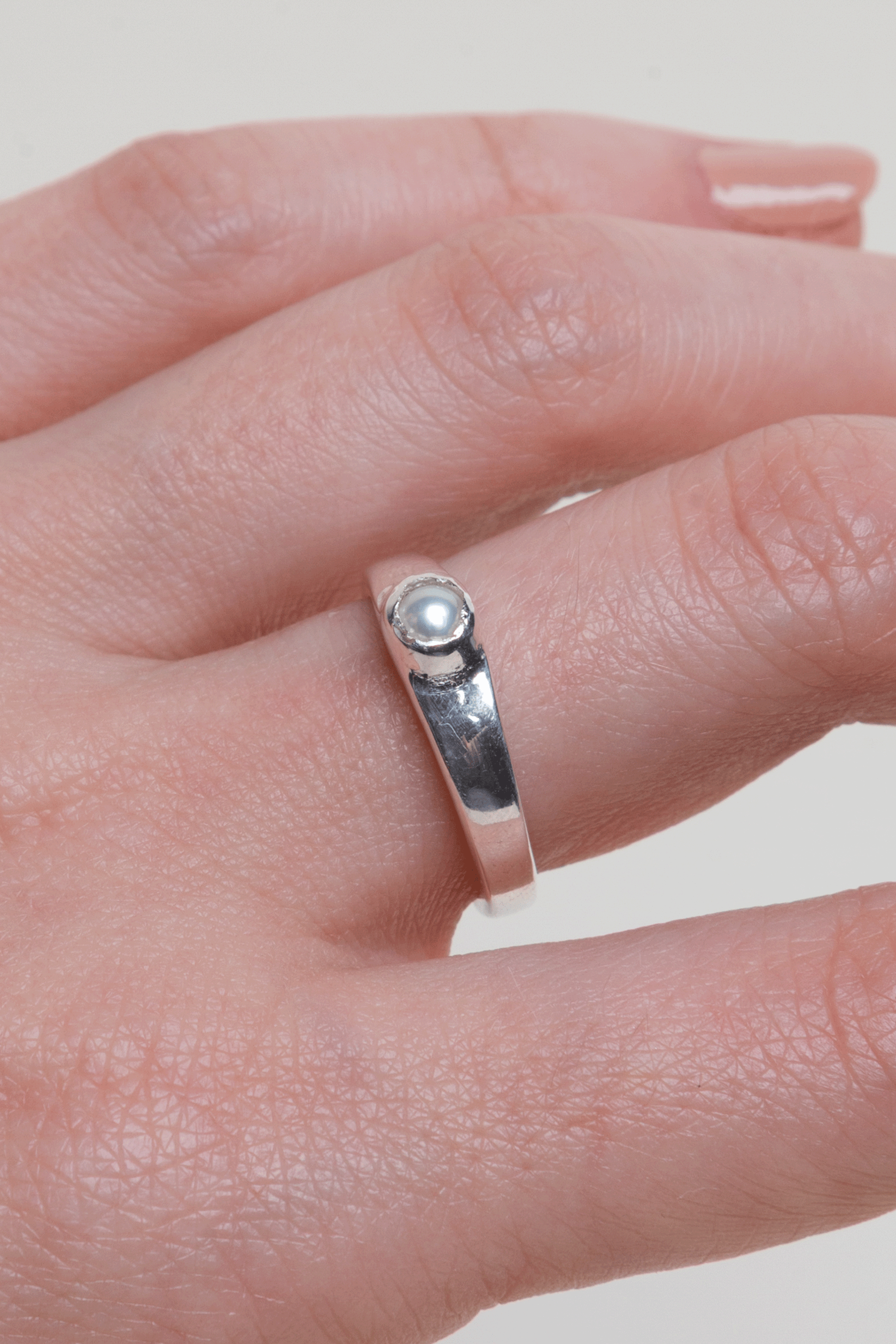 - Anillo delgado, liso y uniforme hecho en plata ley 950 con una mini perla natural redonda engastada en el centro.