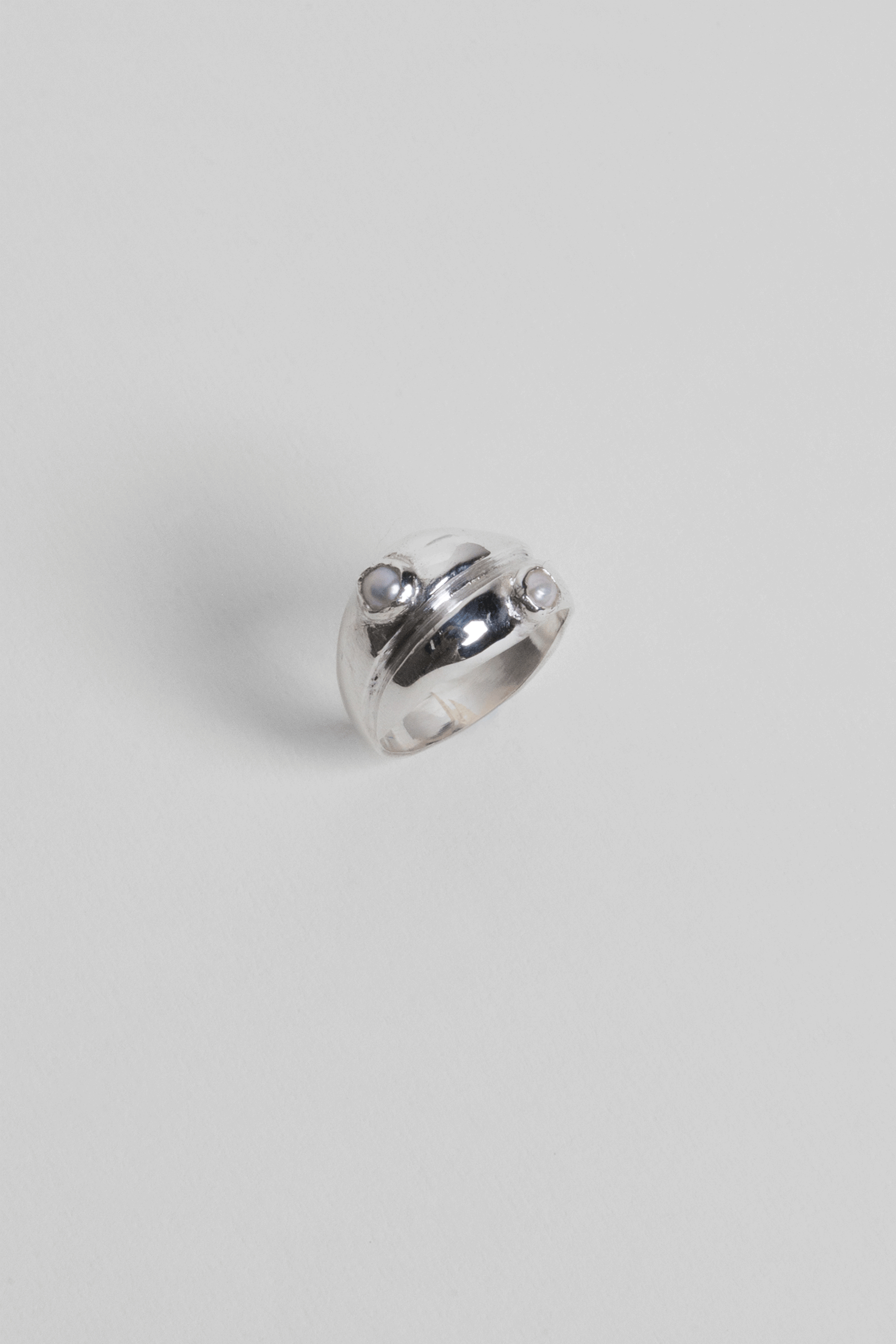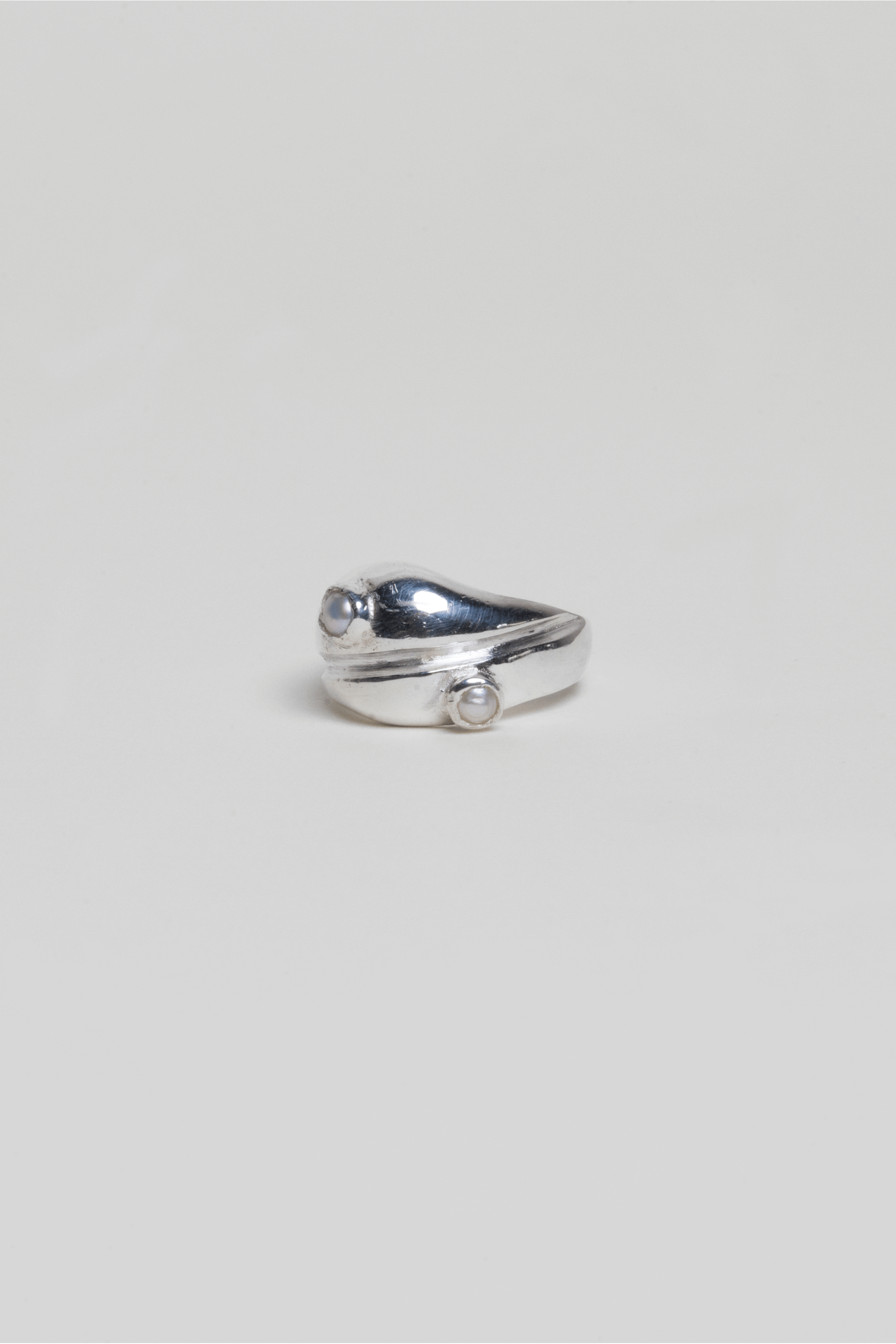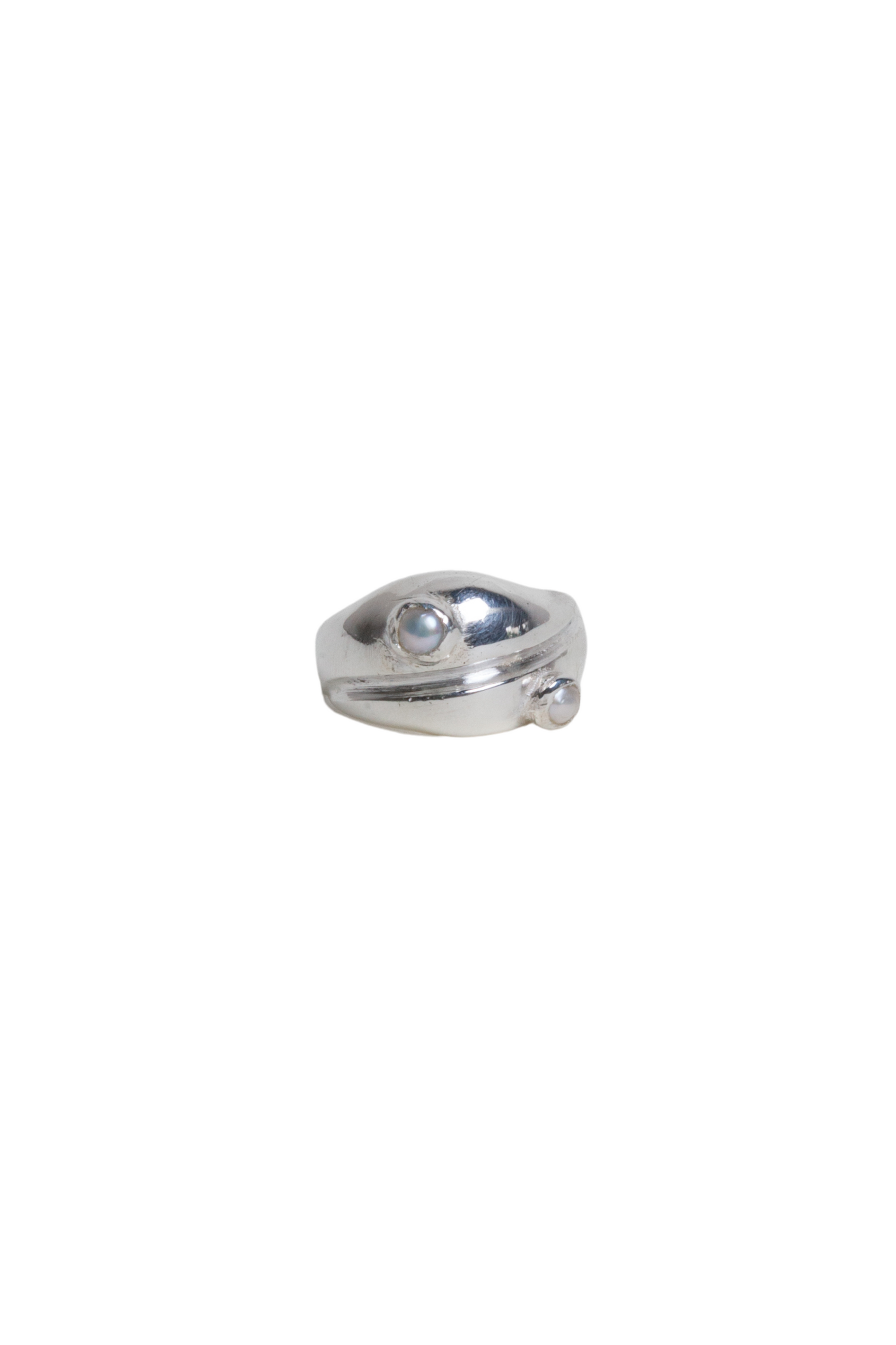 - Anillo liso hecho en plata ley 950 dividido en la mitad con dos perlas naturales de diferente tamaño engastadas en la parte de adelante.