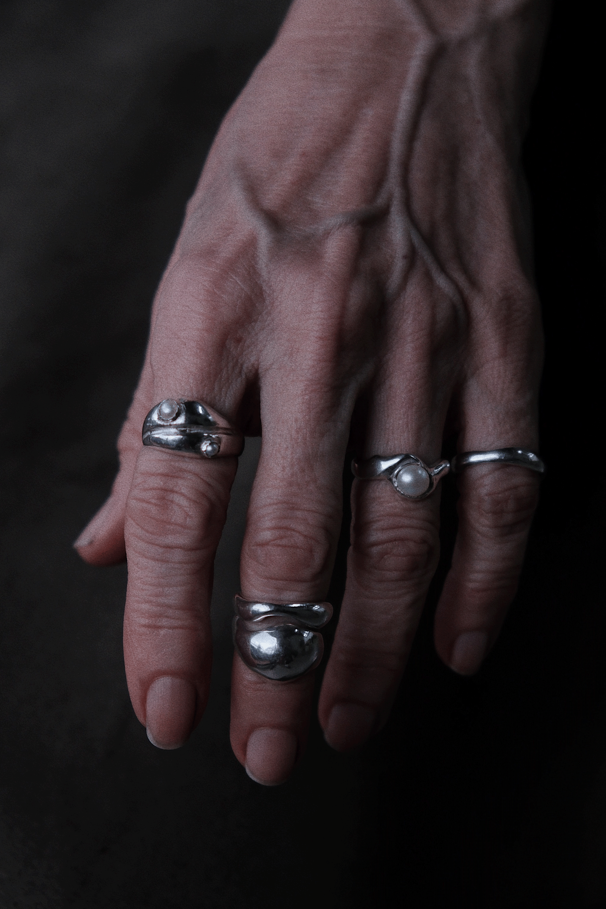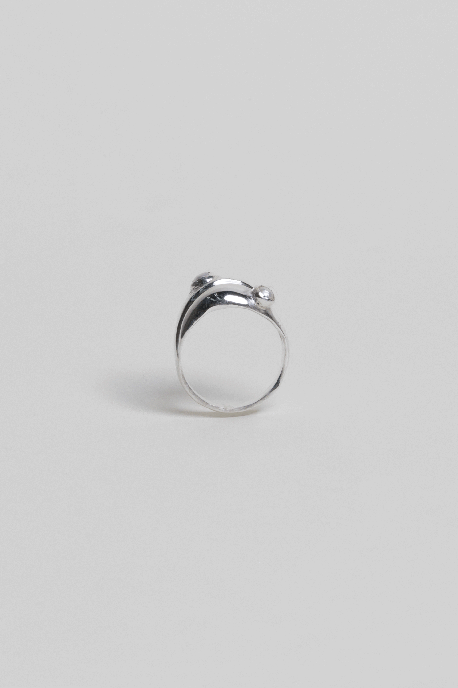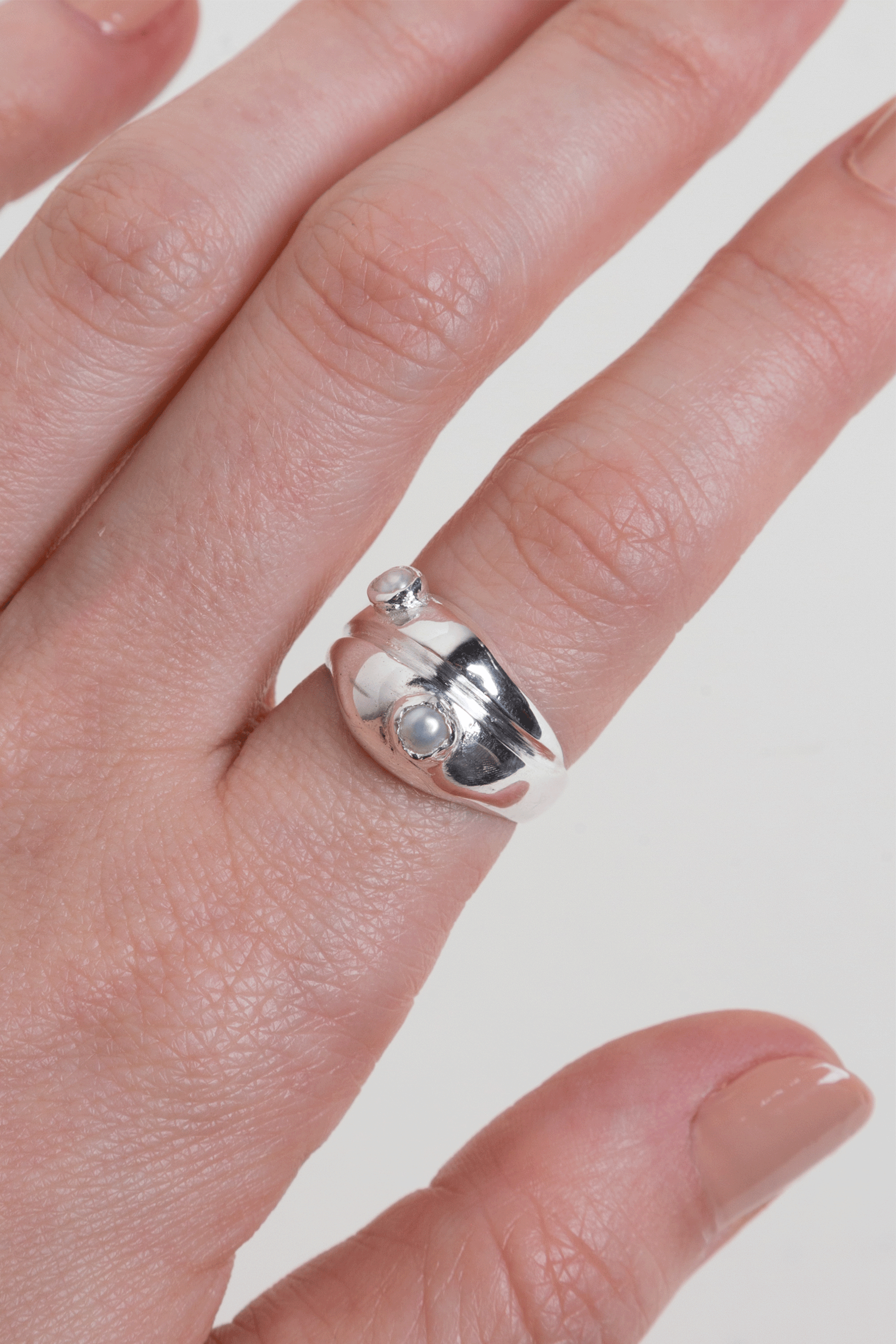 - Anillo liso hecho en plata ley 950 dividido en la mitad con dos perlas naturales de diferente tamaño engastadas en la parte de adelante.