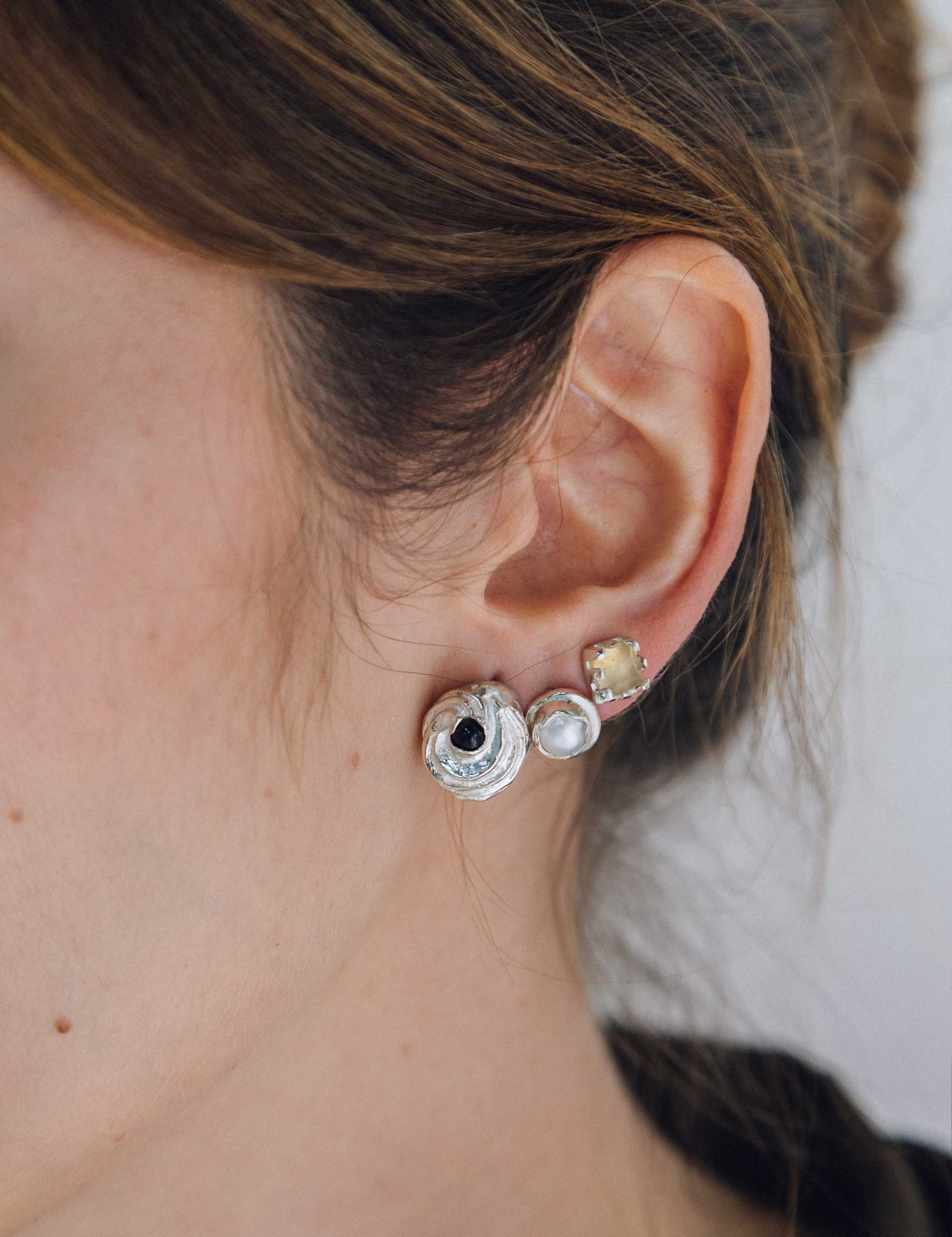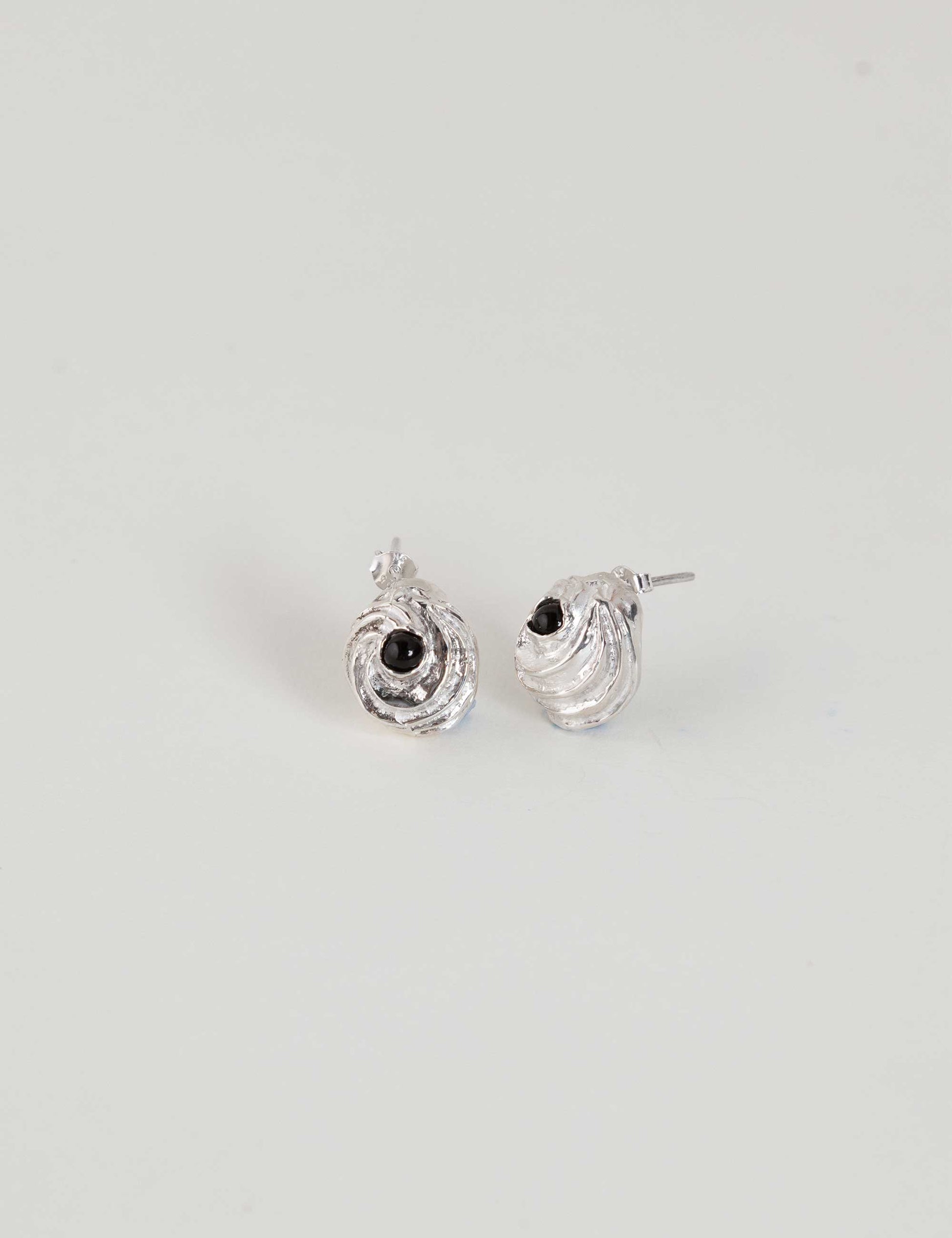 - Aretes en forma de caracol hechos en plata ley 950 con un ágata negra engastada en cada arete.