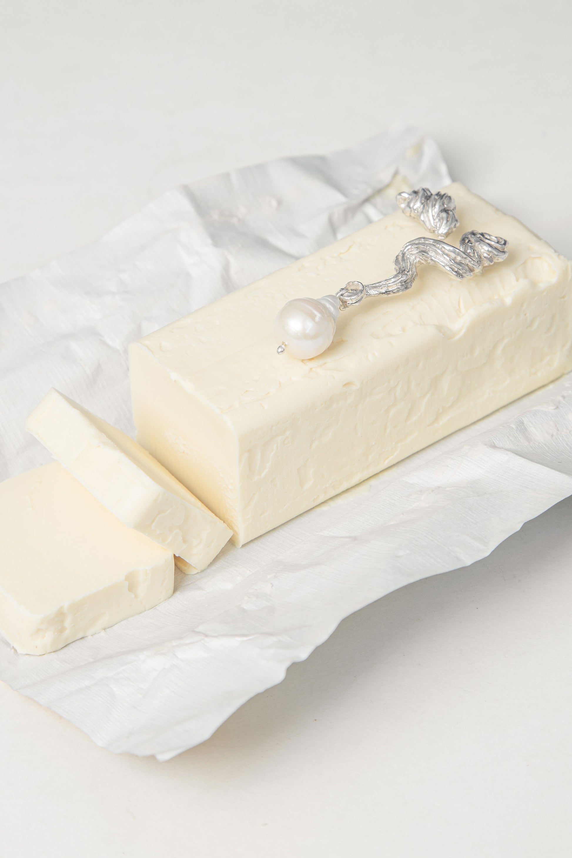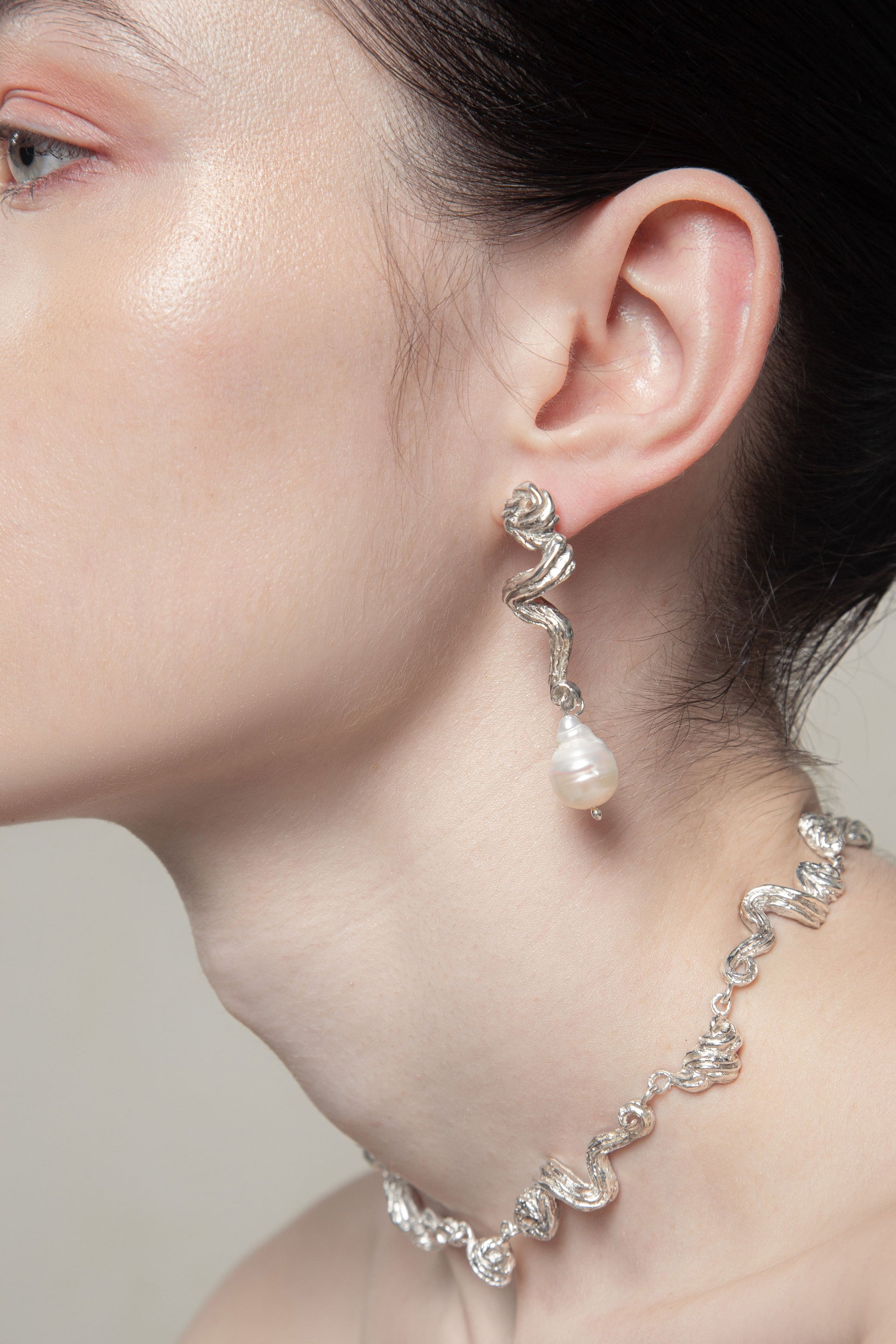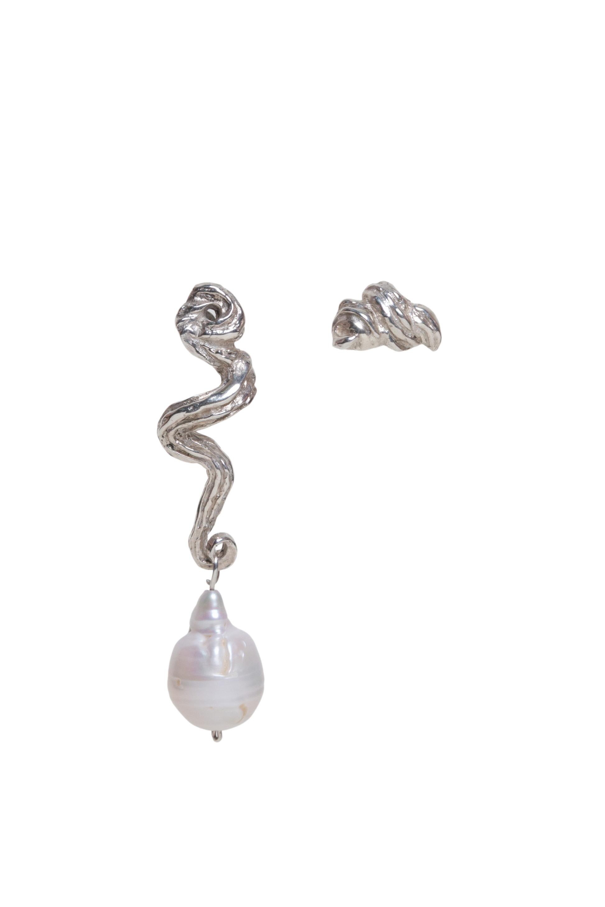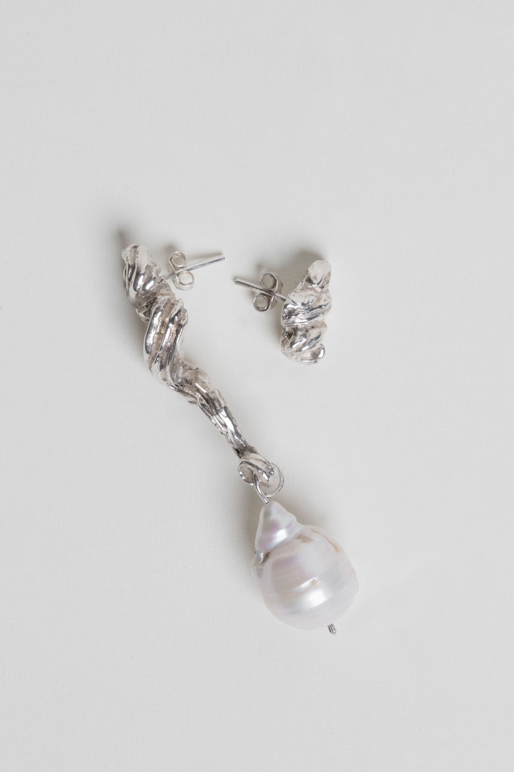 - Aretes irregulares con textura de mantequilla batida que pasó por una manga pastelera hechos en plata ley 950.