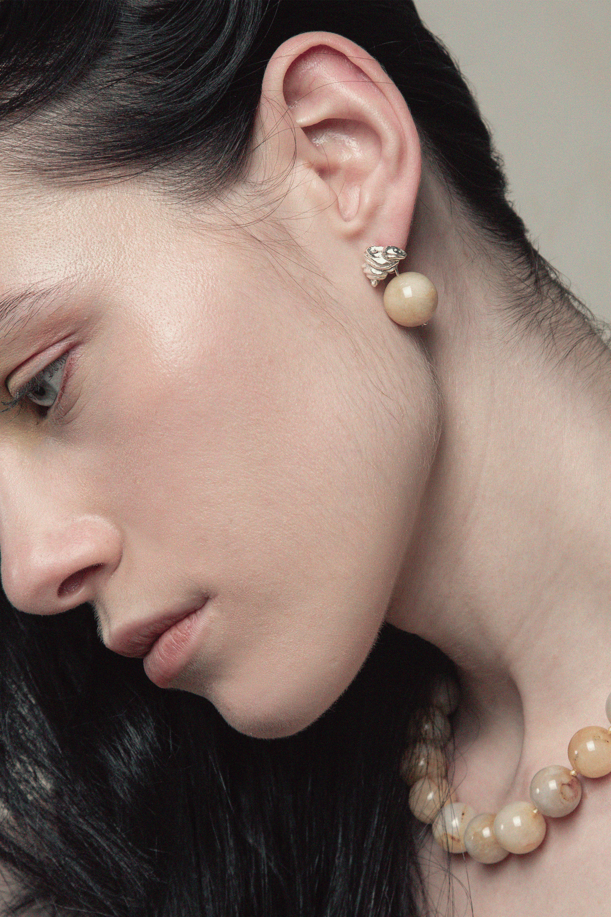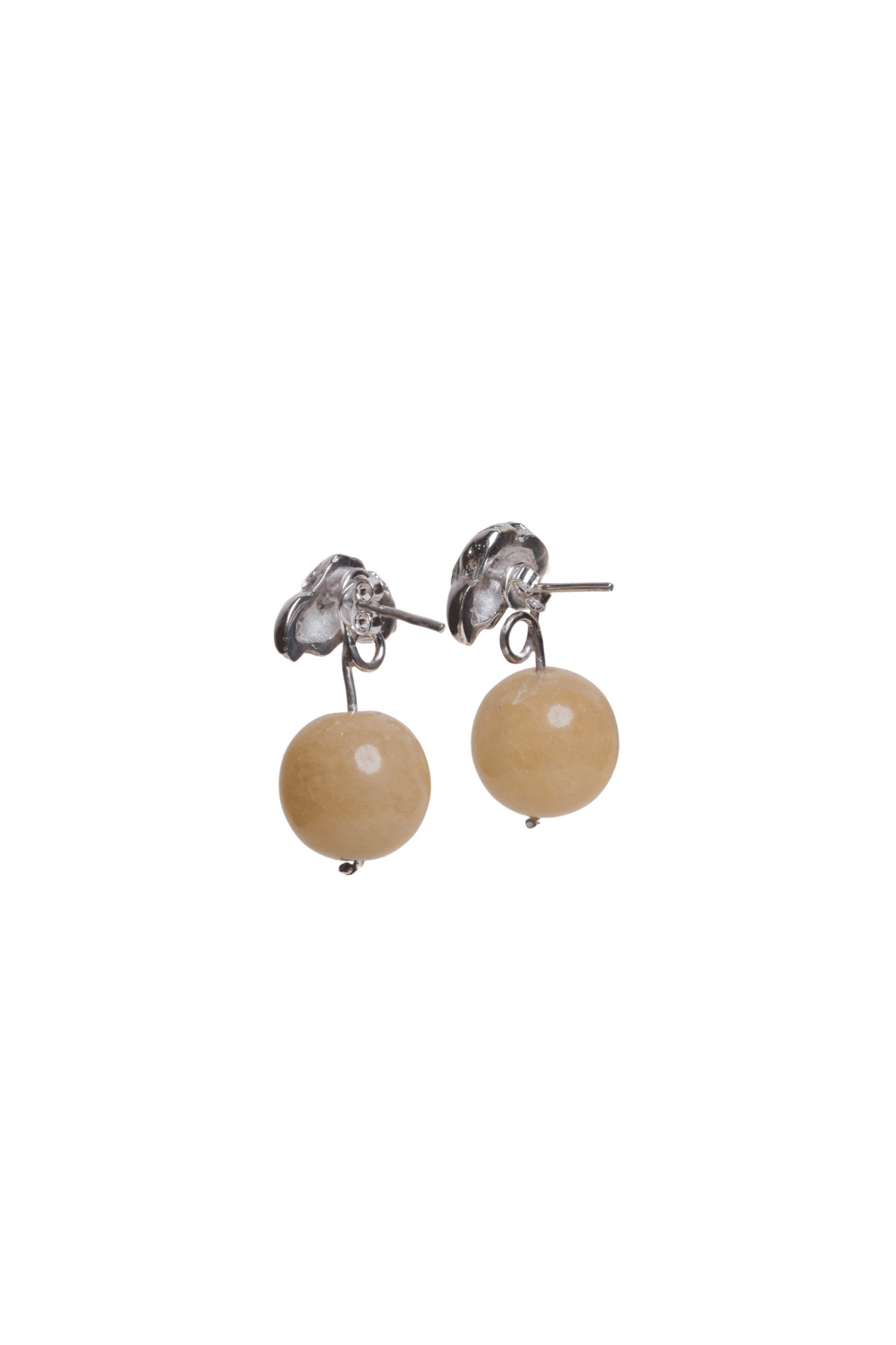 - Aretes dobles hechos en plata ley 950 con una aventurina colgando atrás de cada topo con textura de mantequilla batida, croissant o nube.
