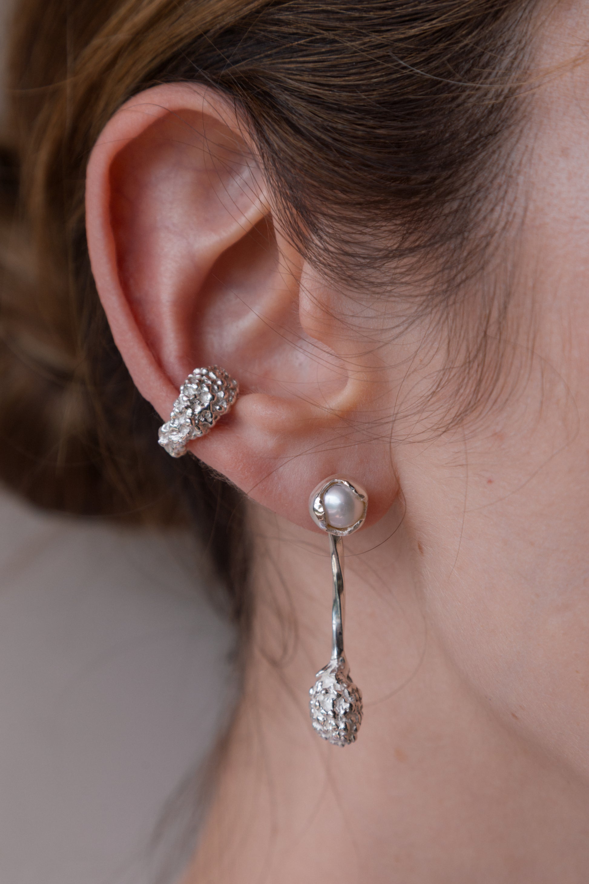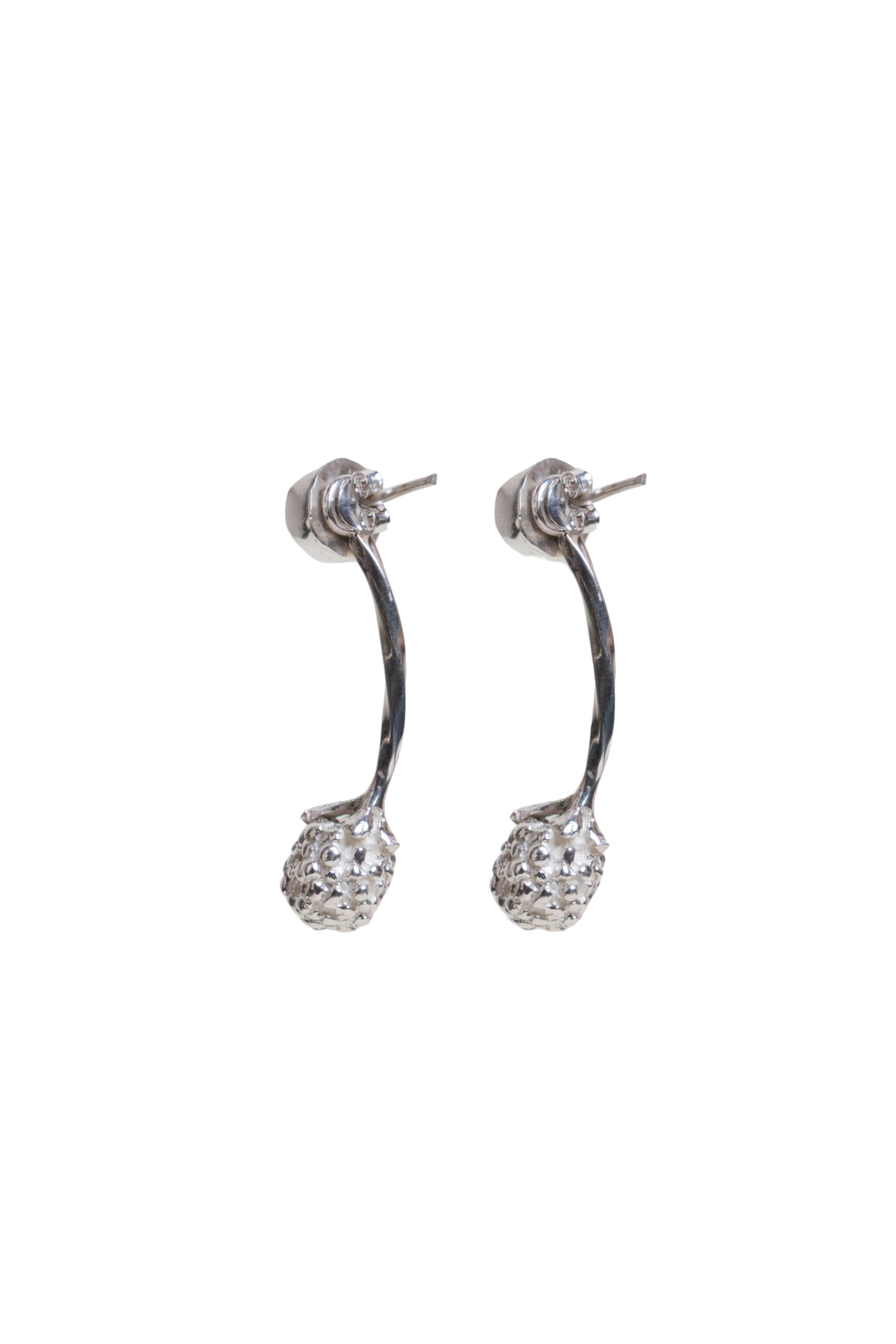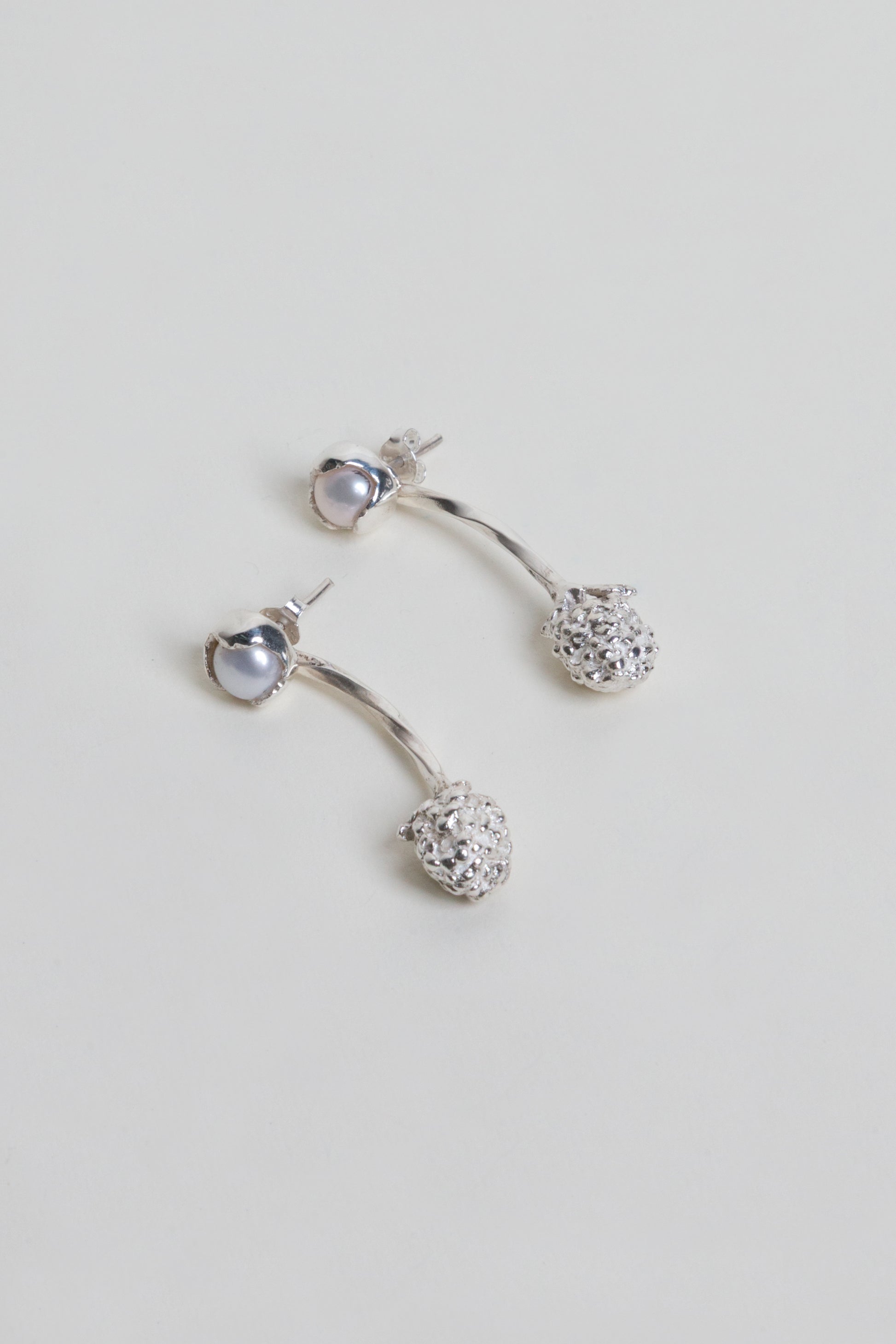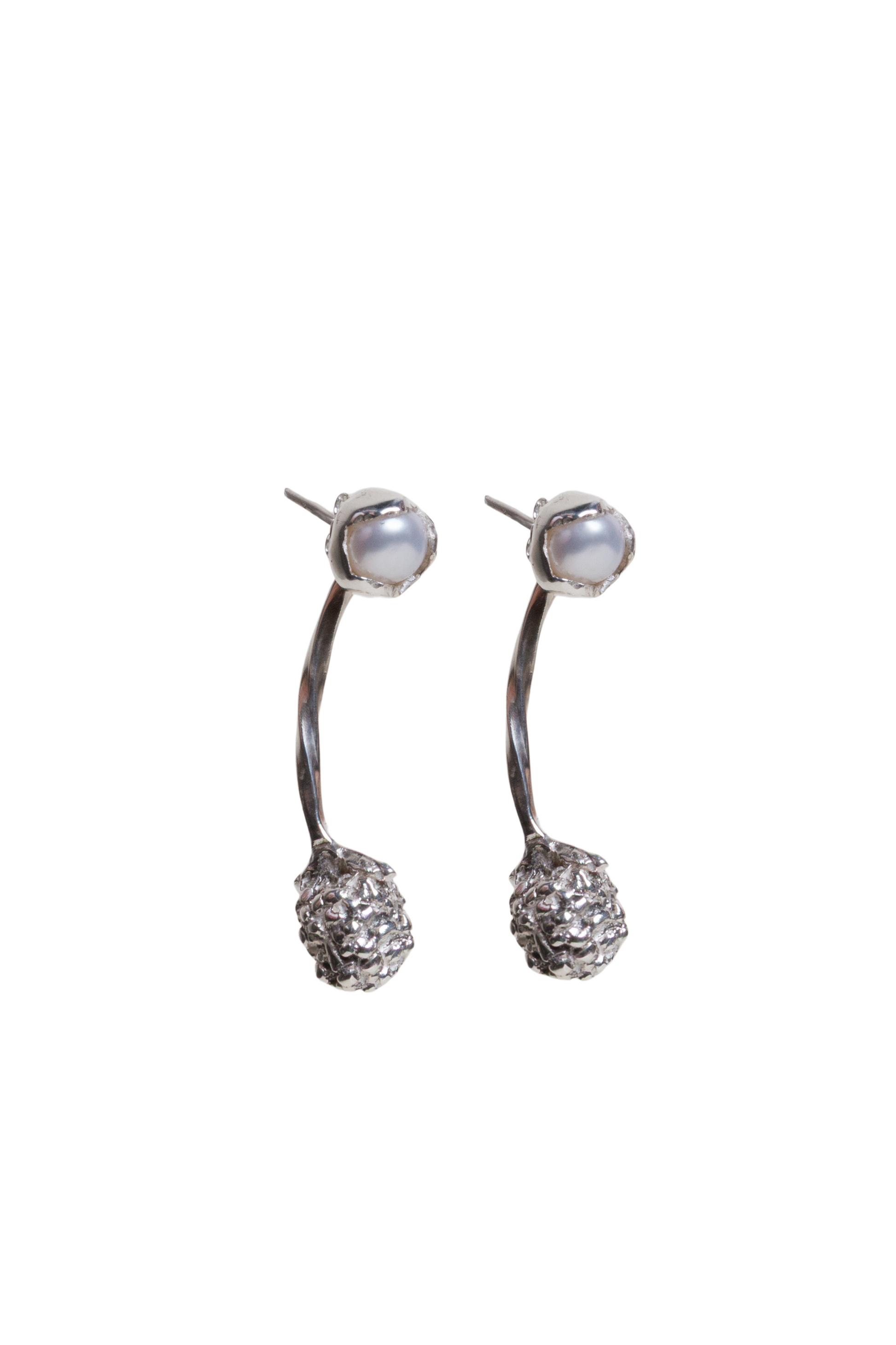- Aretes dobles, los topos son perlas naturales engastadas en una caja hecha en plata ley 950 y de atrás le cuelga a cada uno una mora también hecha en plata ley 950.