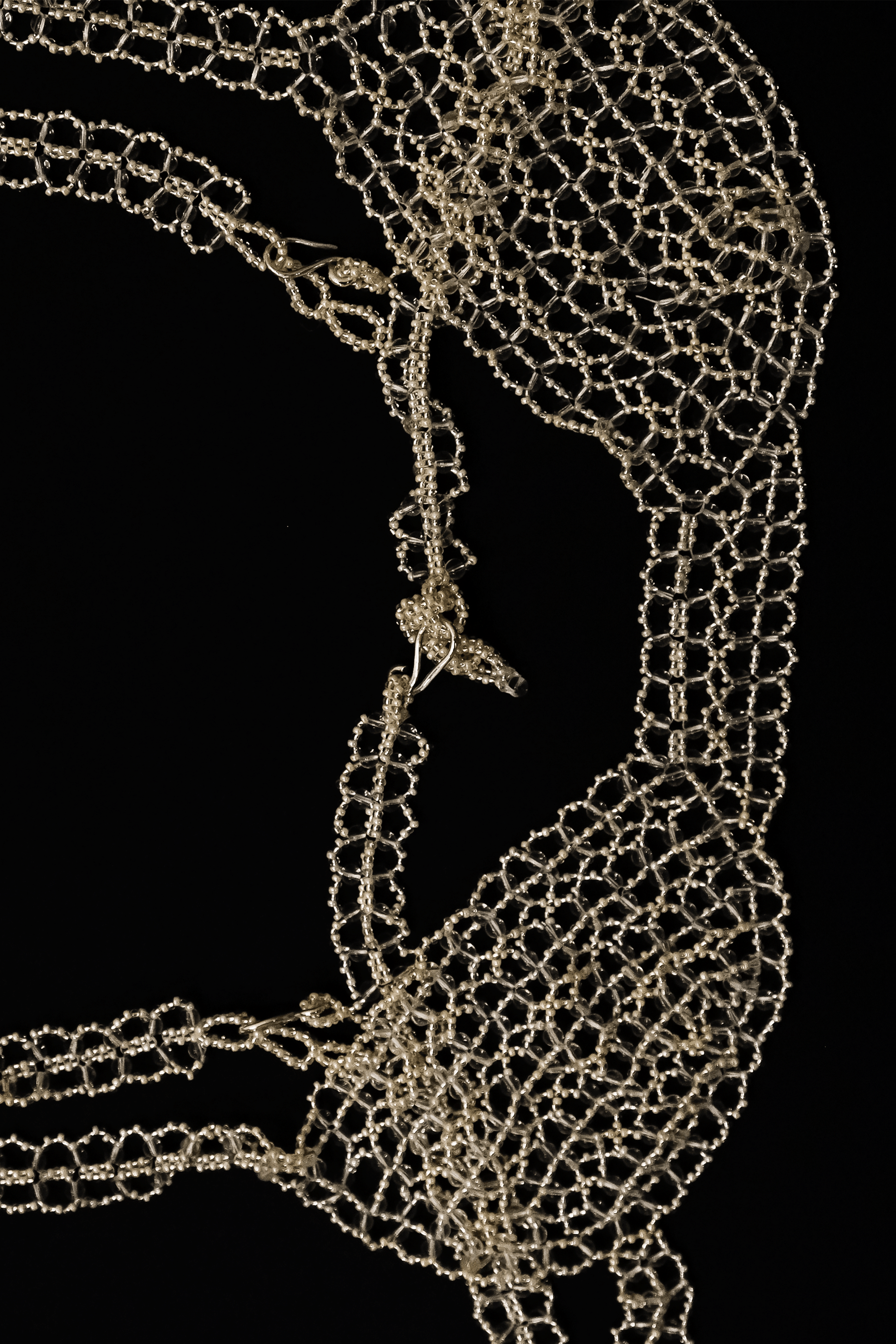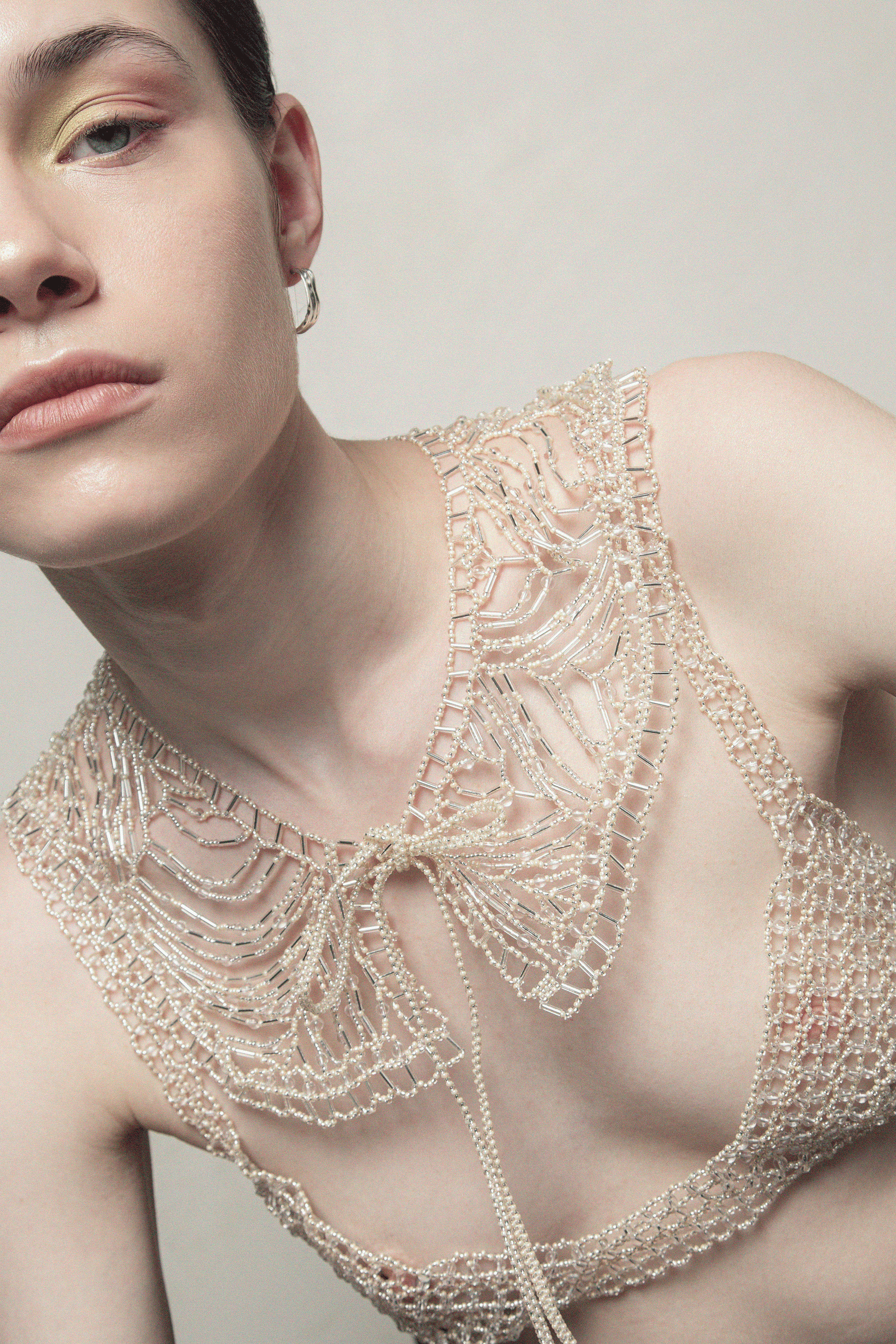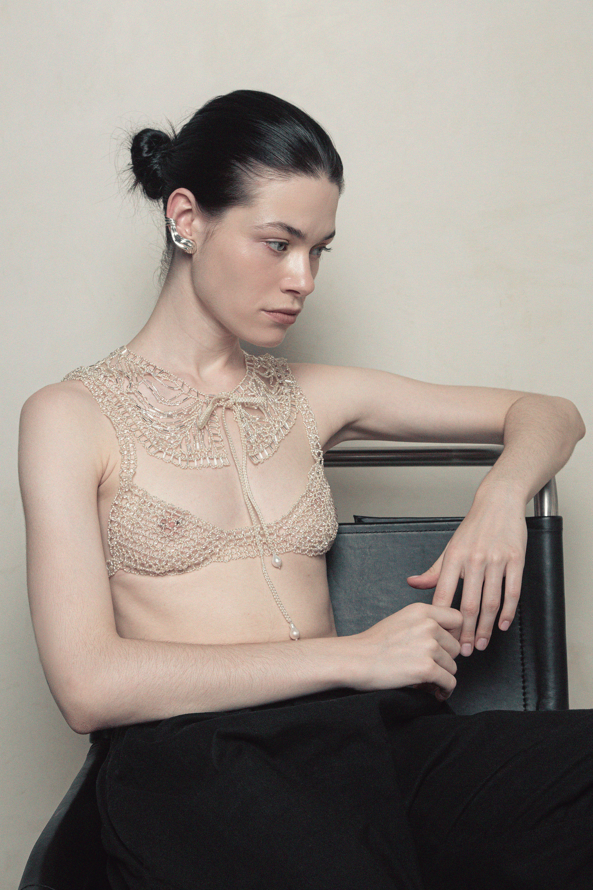 - Bralette tejido a mano con hilo, mostacillas y cuarzo cristal (piedra transparente).