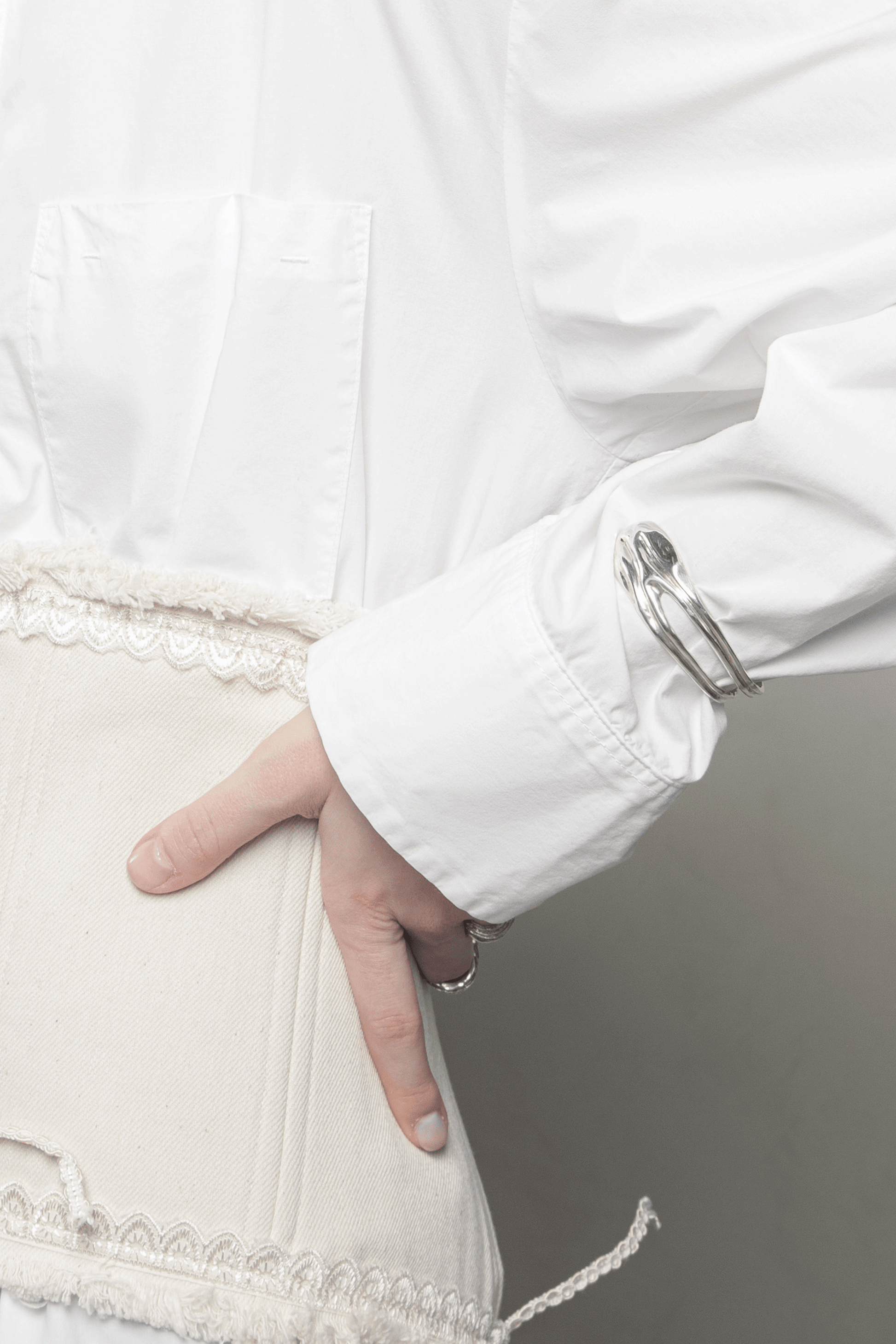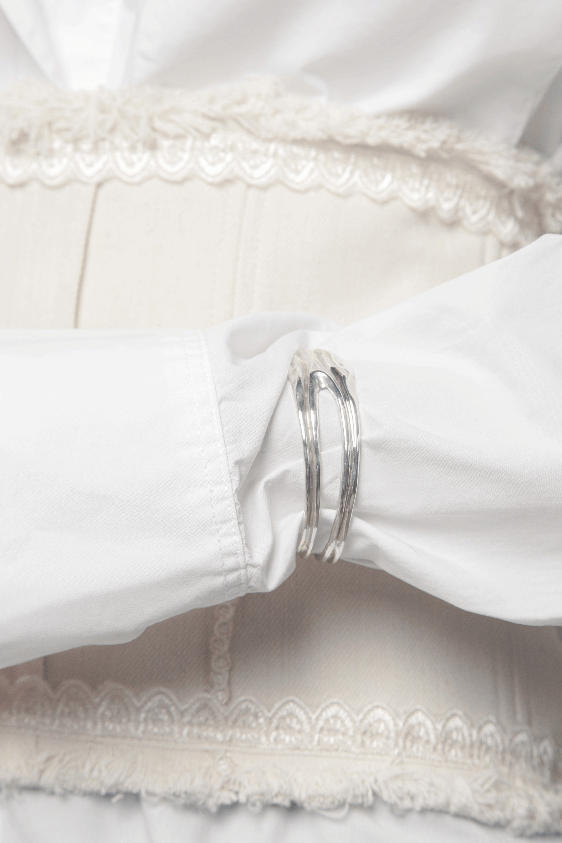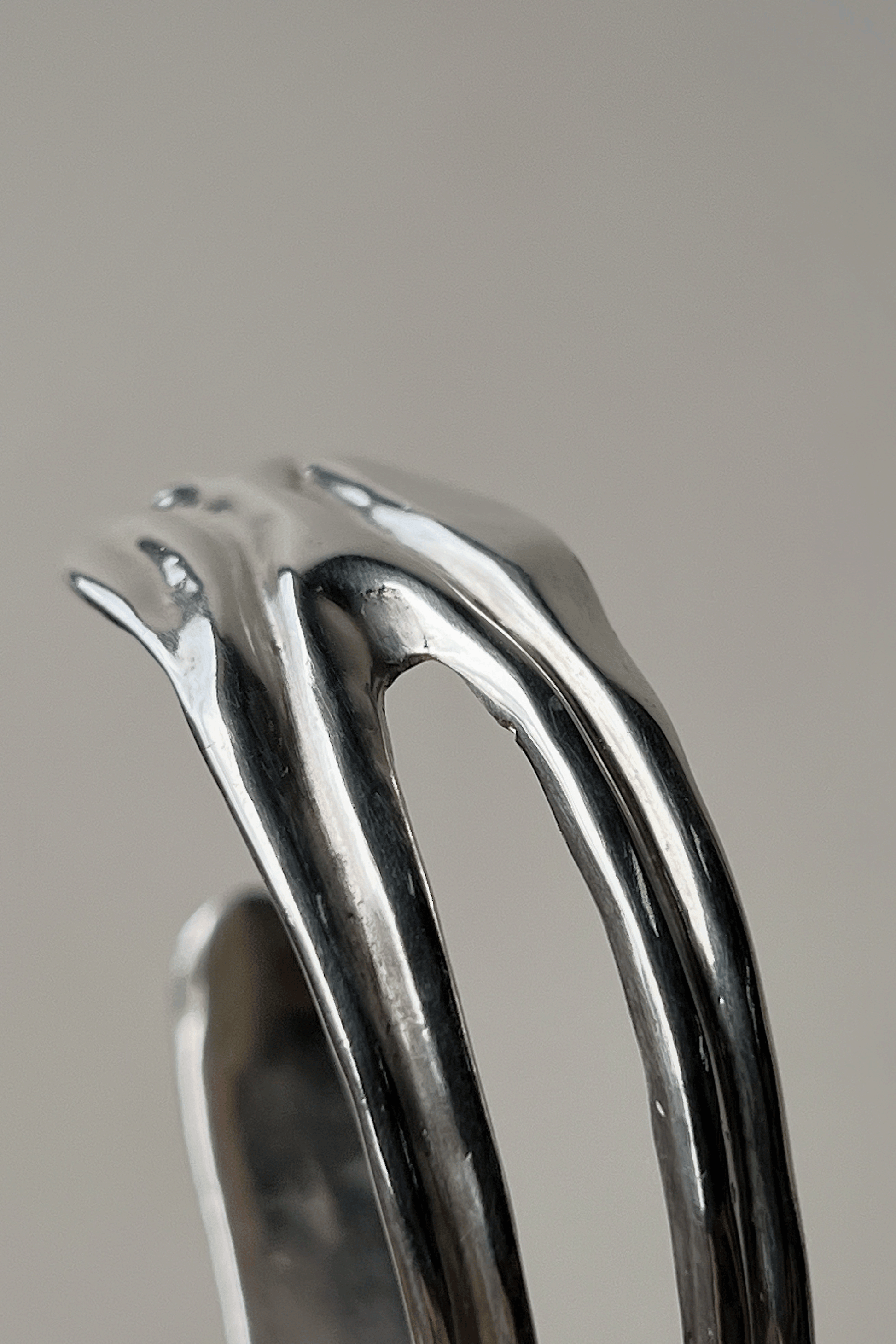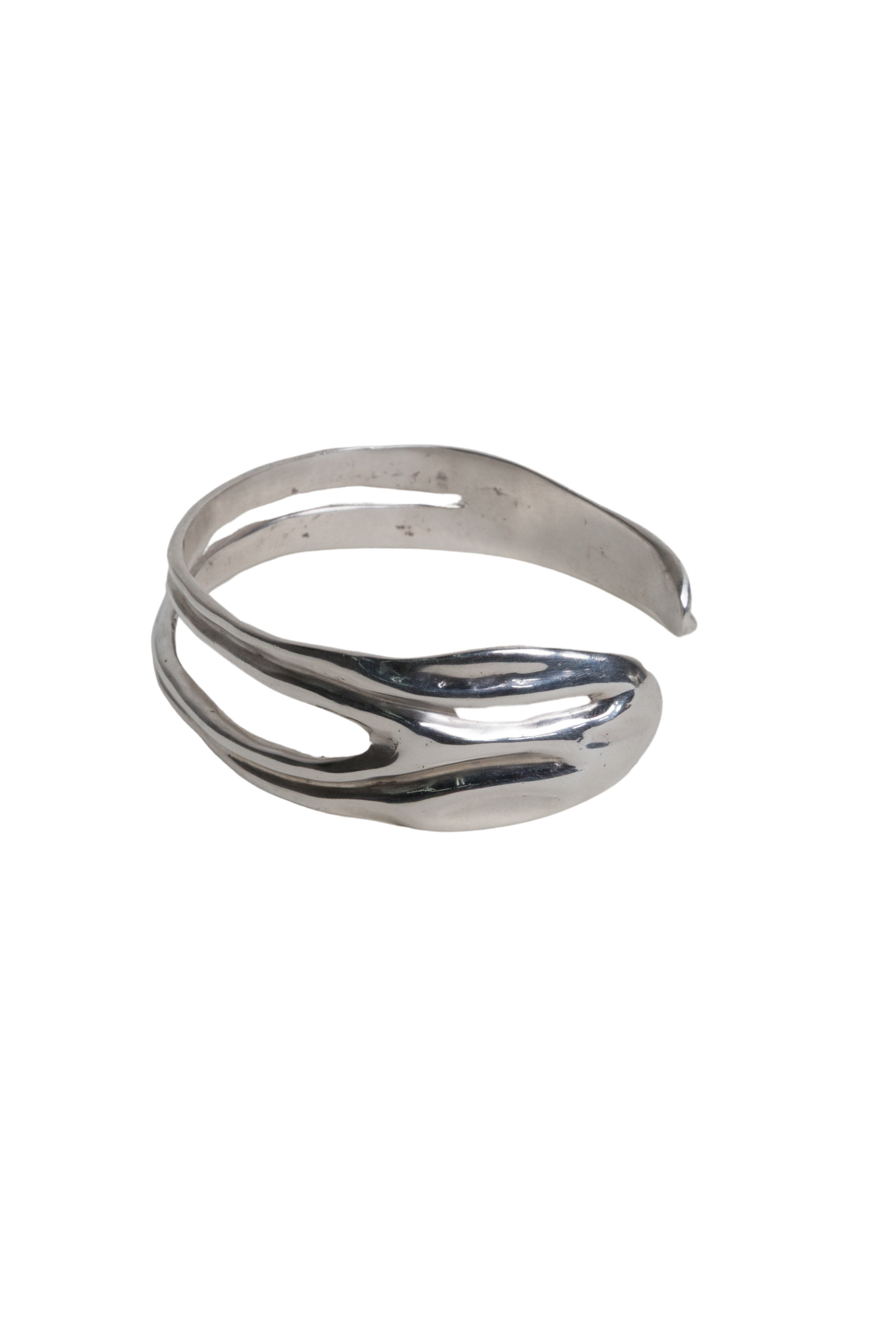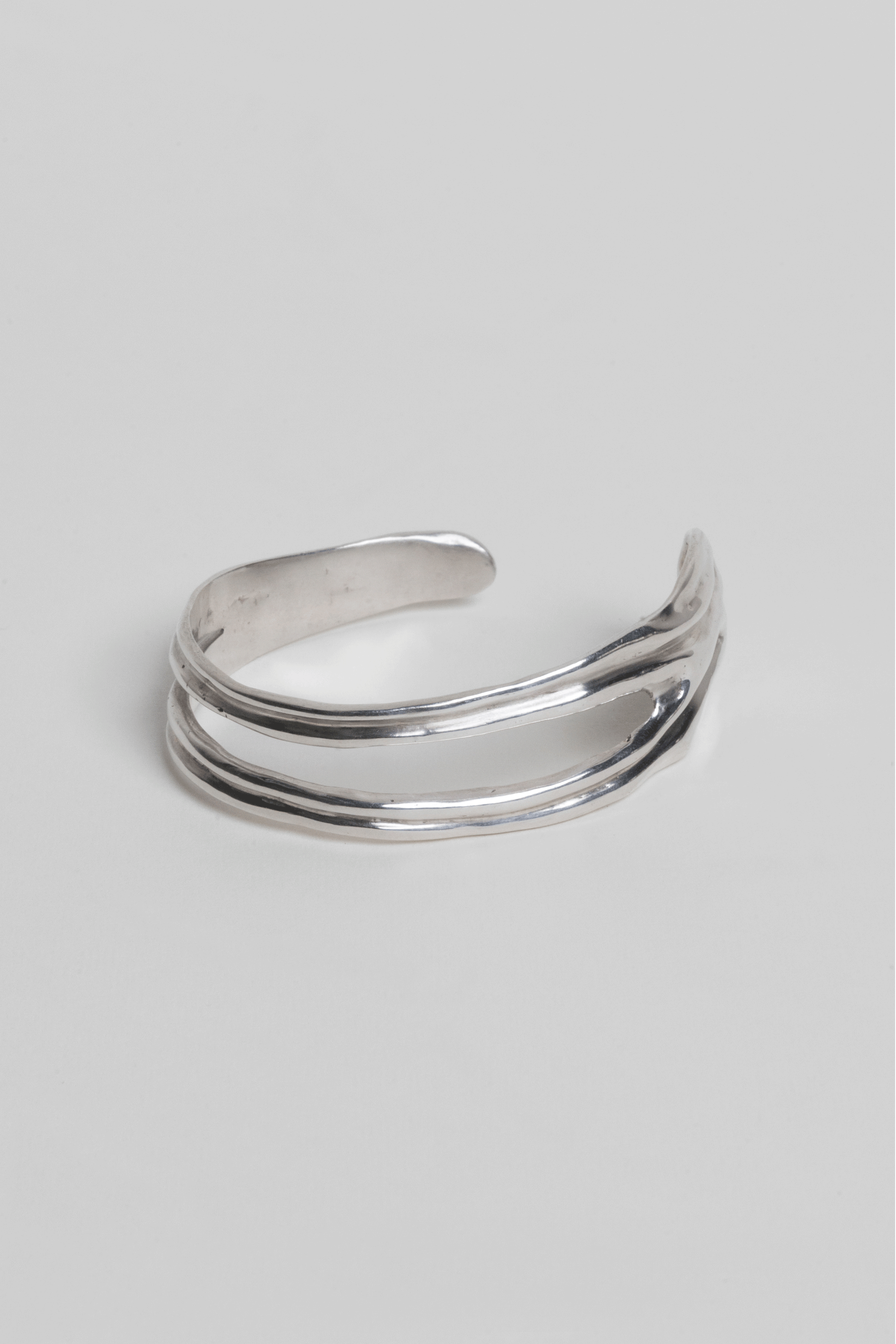 - Brazalete ajustable hecho en plata ley 950 con textura corrugada.