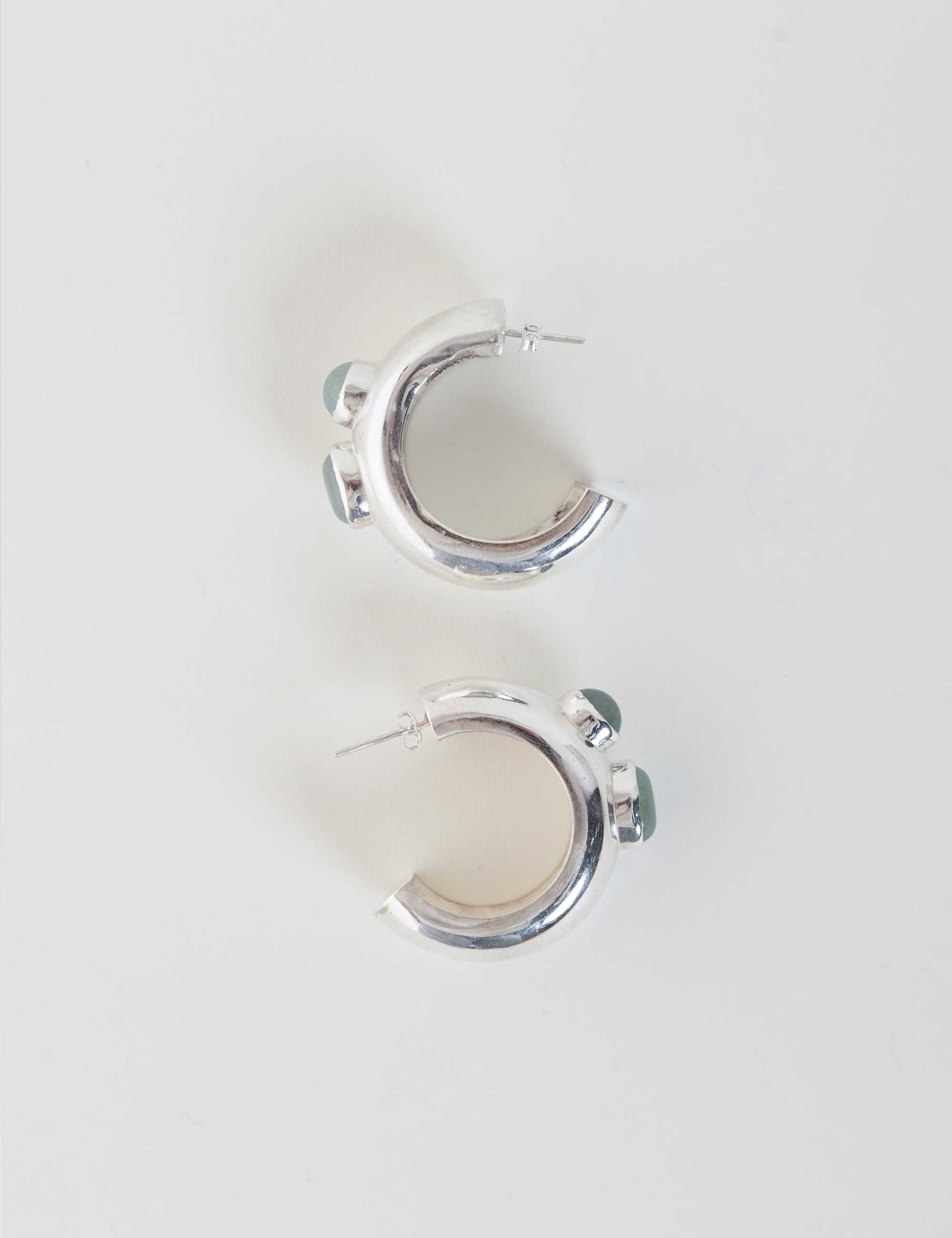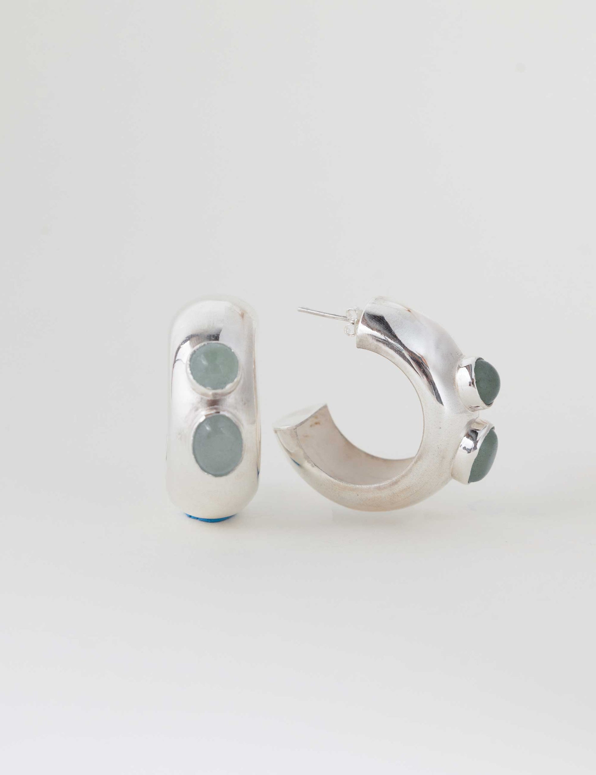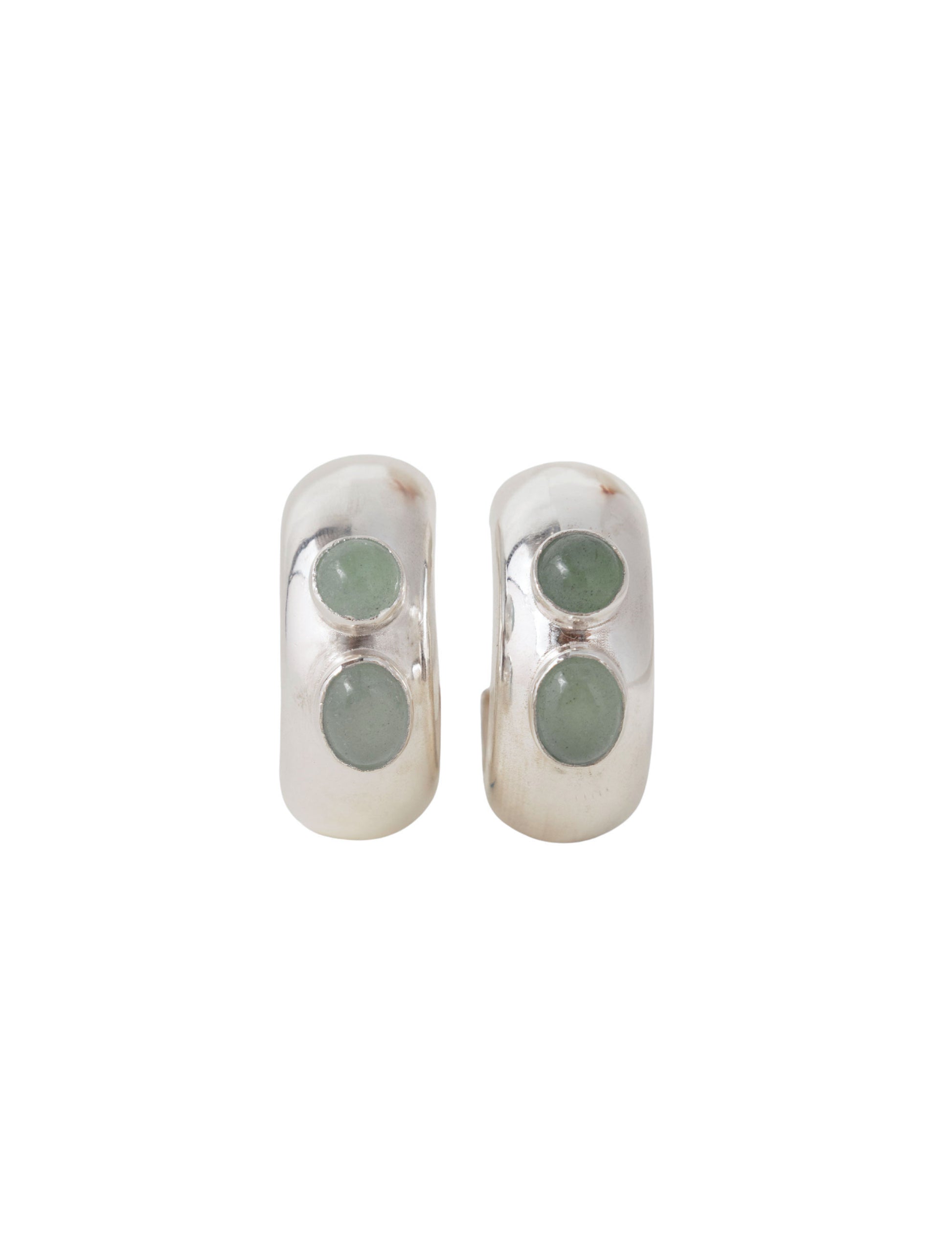- Candongas hechas en plata ley 950 con dos crisoprasas engastadas en el centro, una redonda y la otra ovalada.