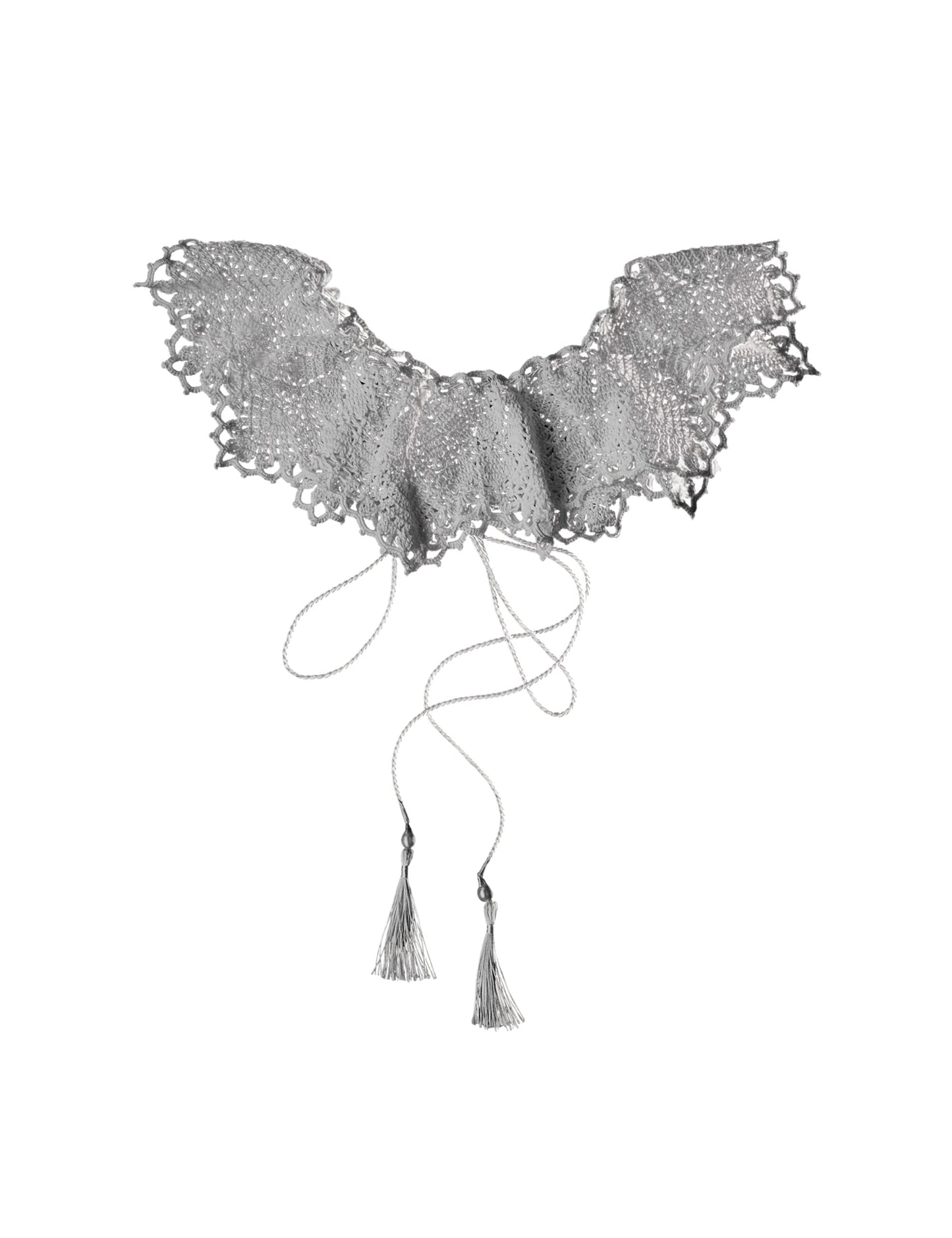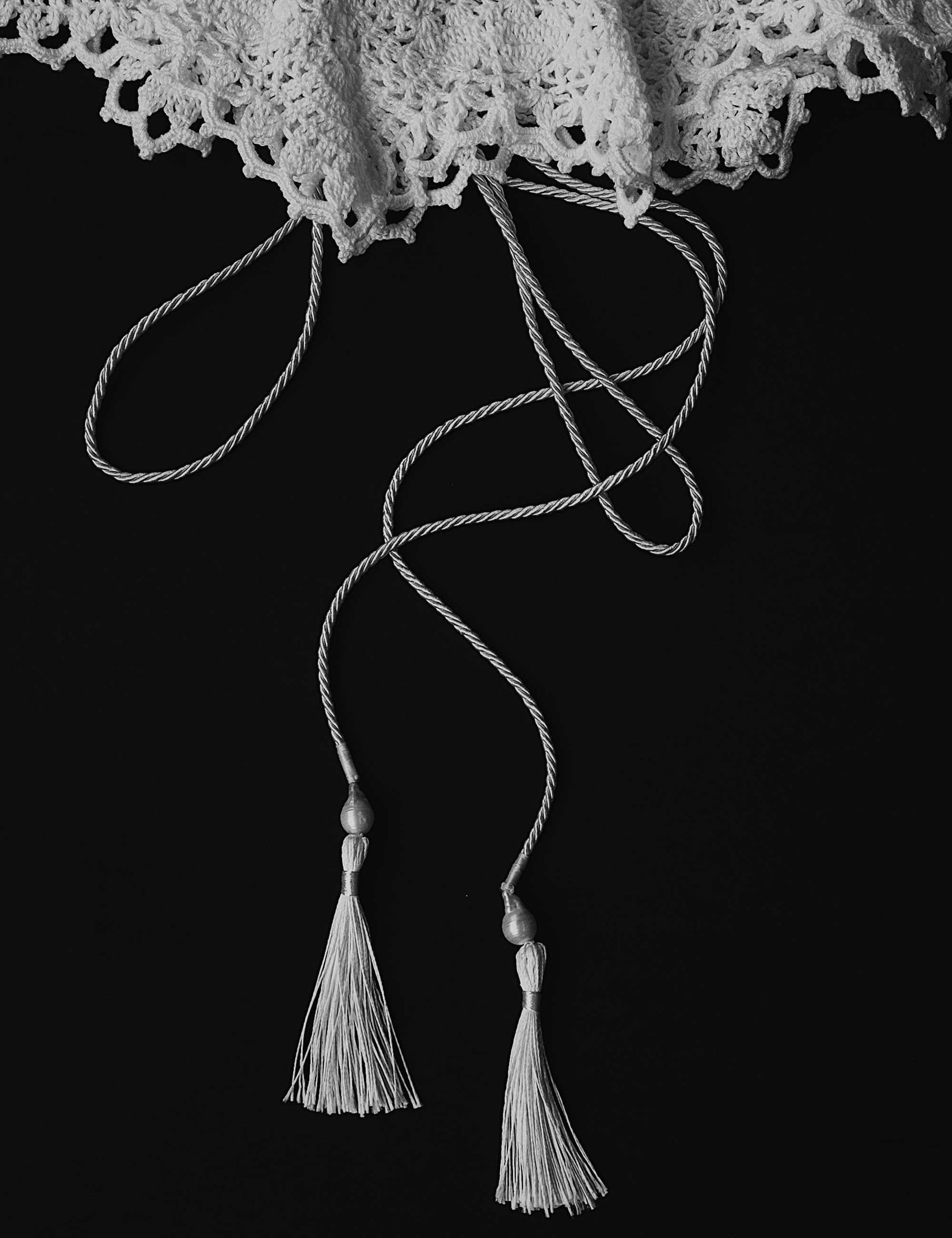 - Con cordón blanco para ajustarlo y terminación de perla barroca y borla blanca a cada lado.