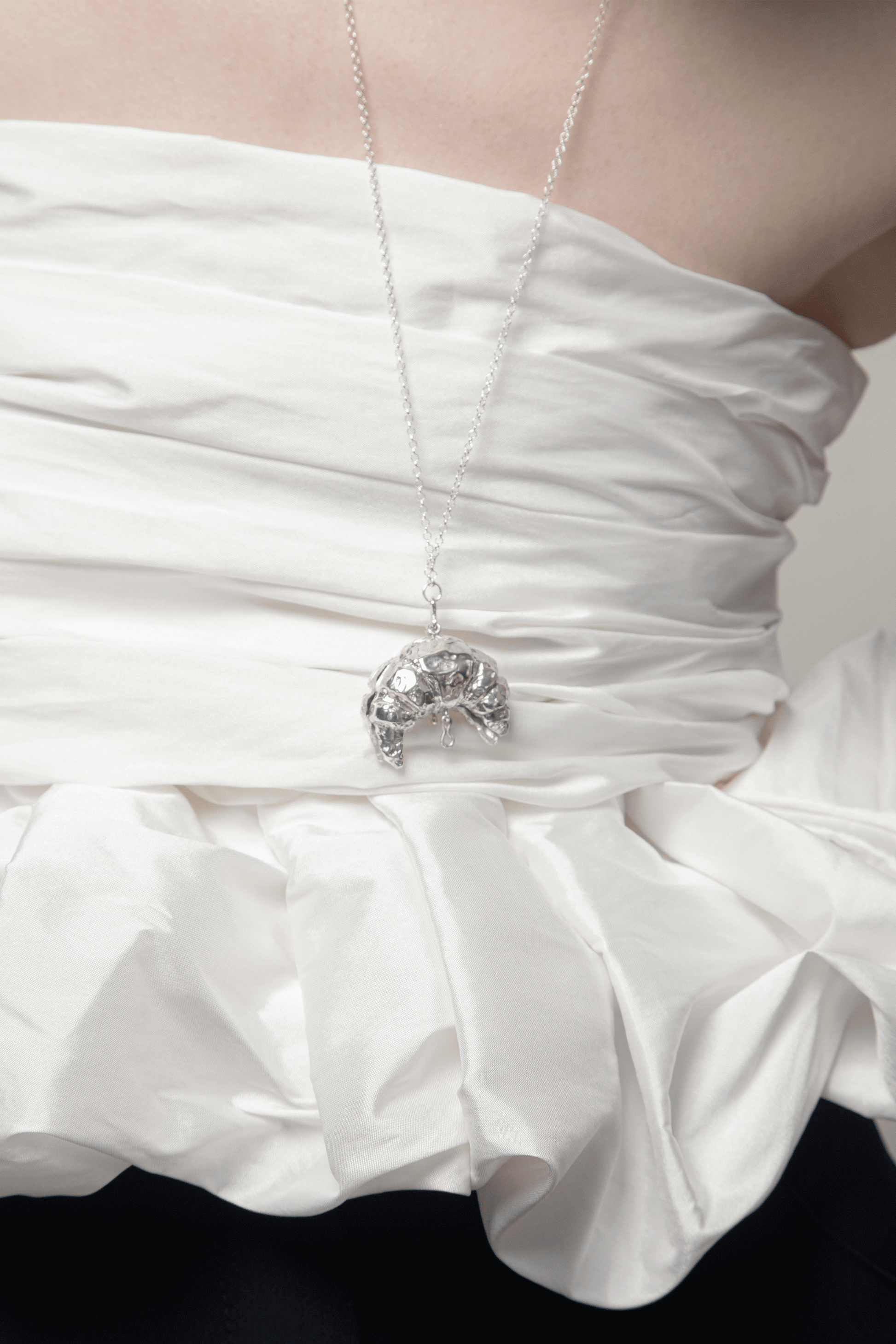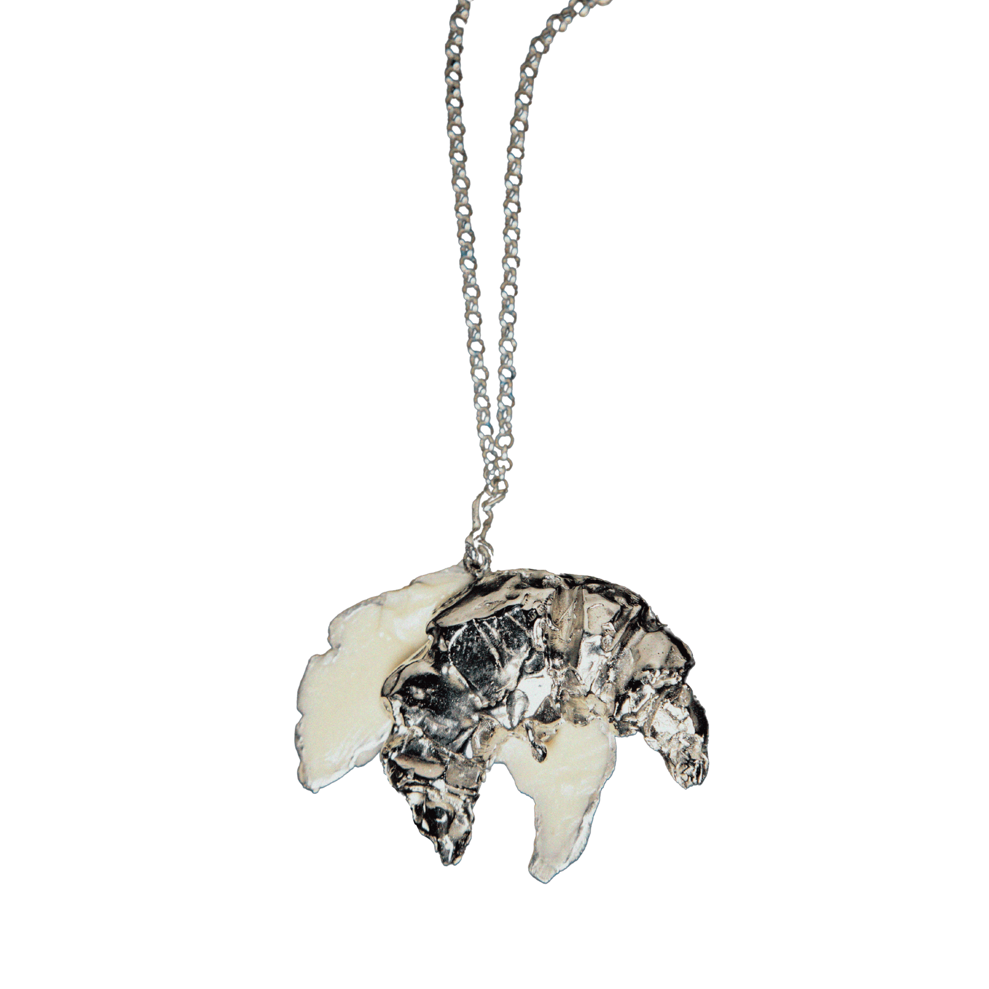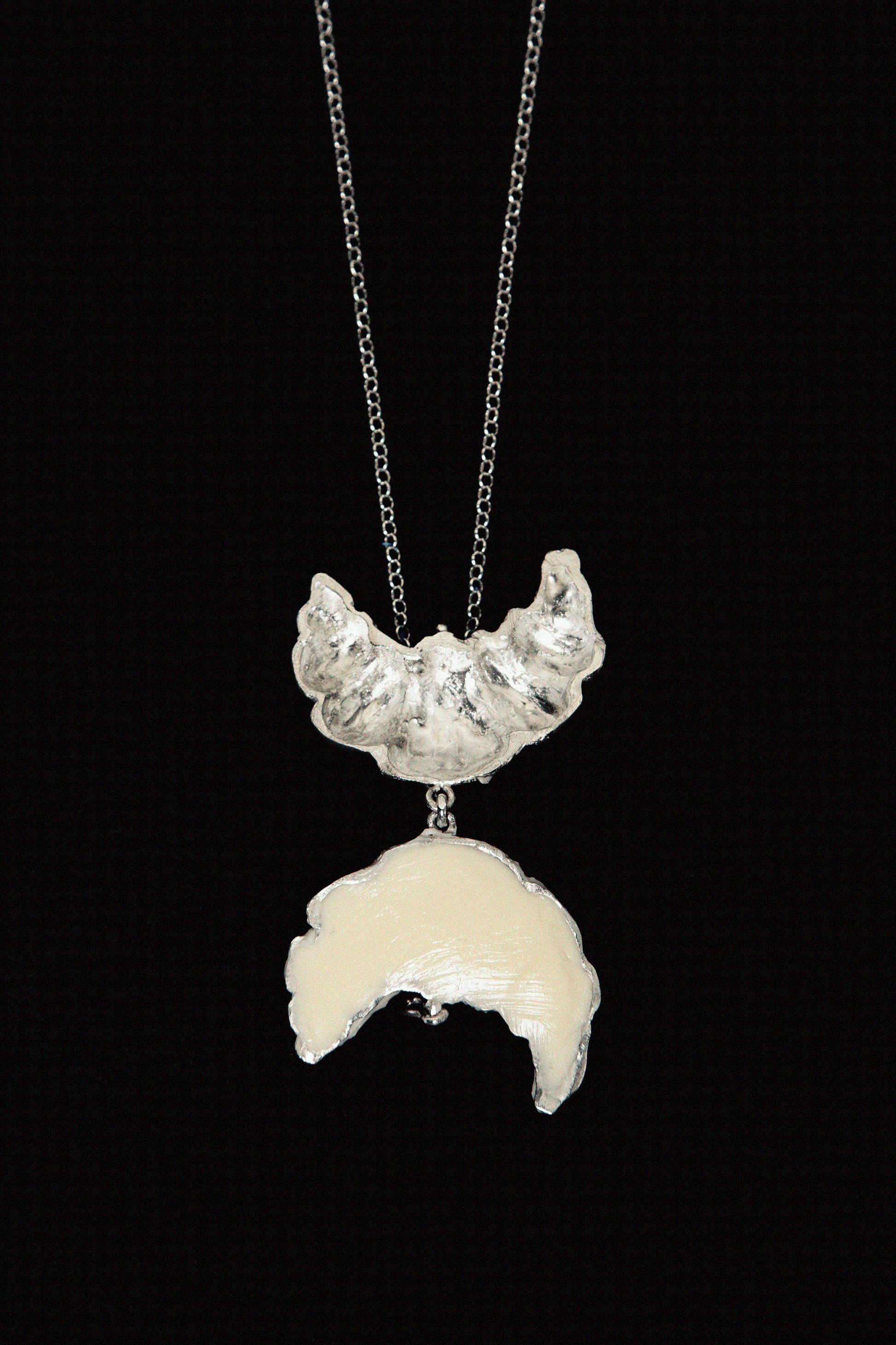 - Collar que es un relicario en forma de croissant hecho en plata ley 950.