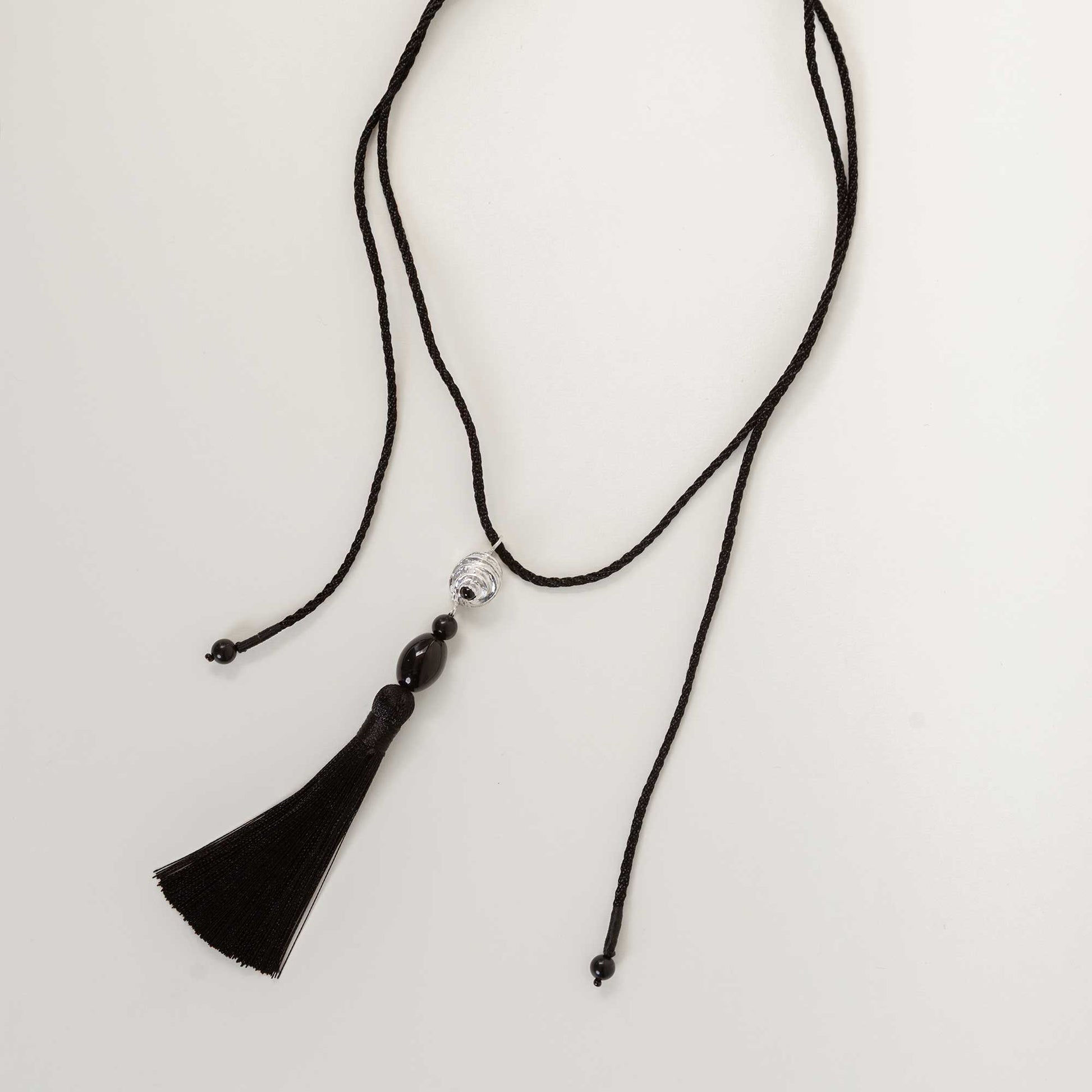 - Collar con dije hecho en plata ley 950, un ónix engastado en el centro y colgando, dos ágatas negras junto a una borla.