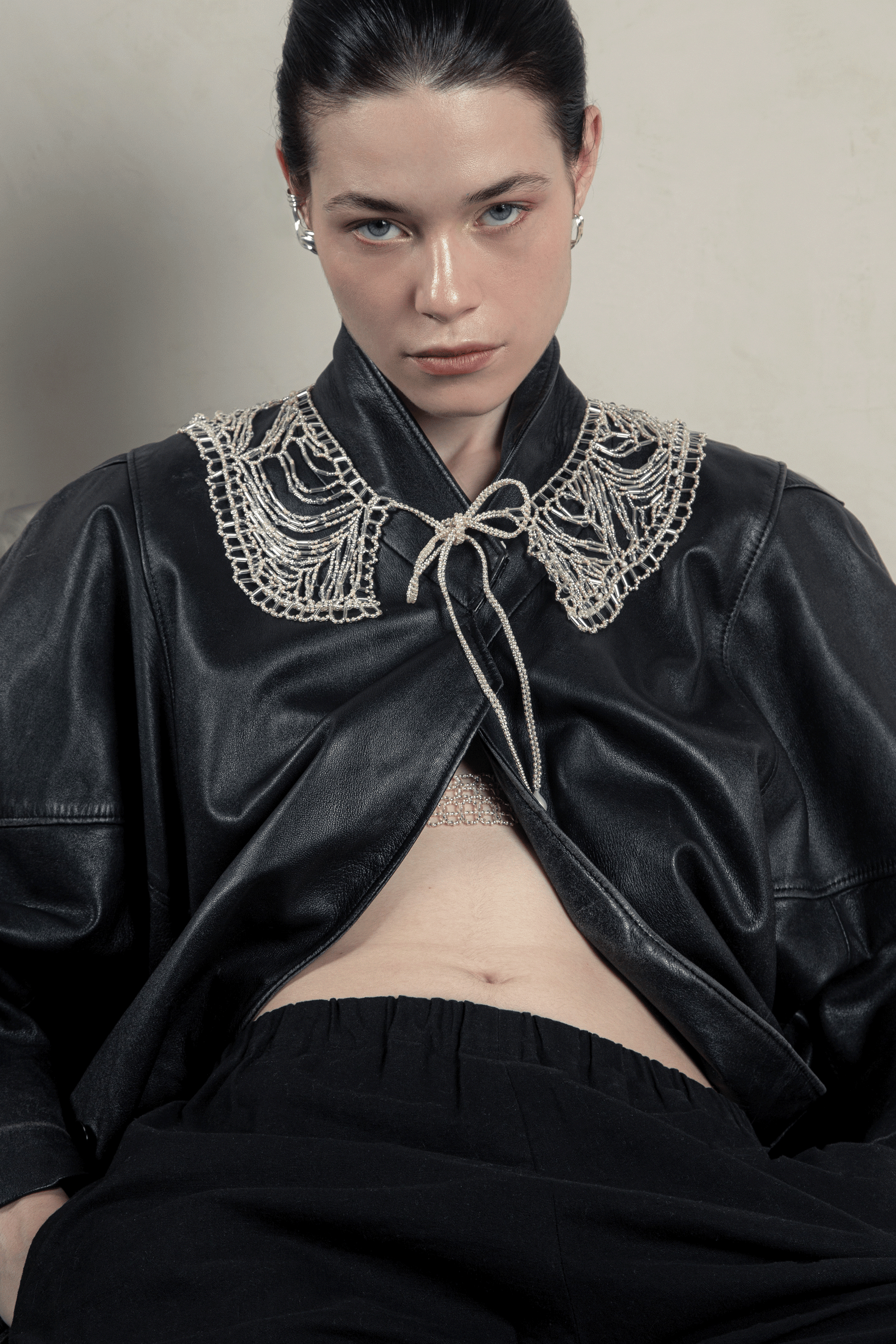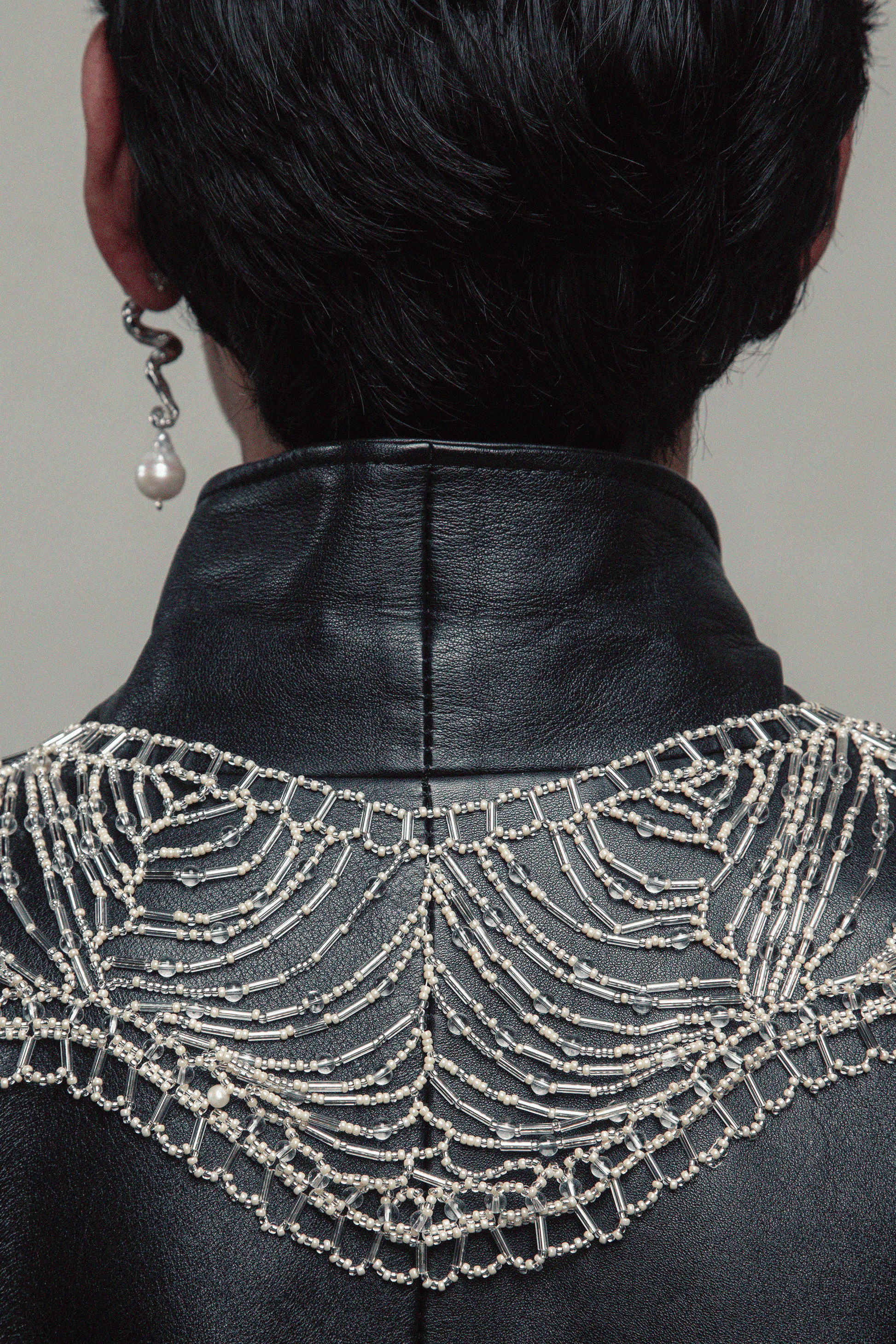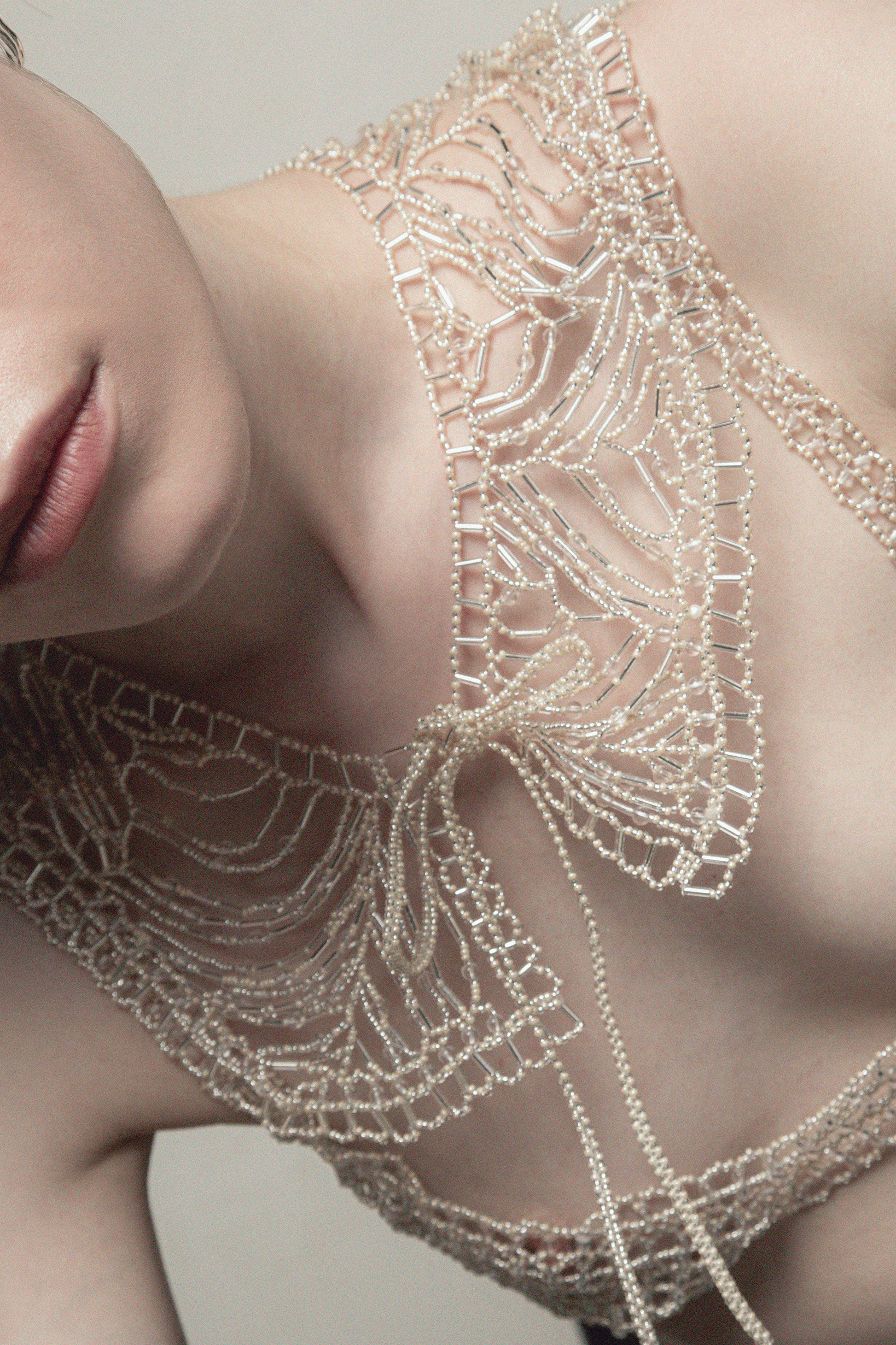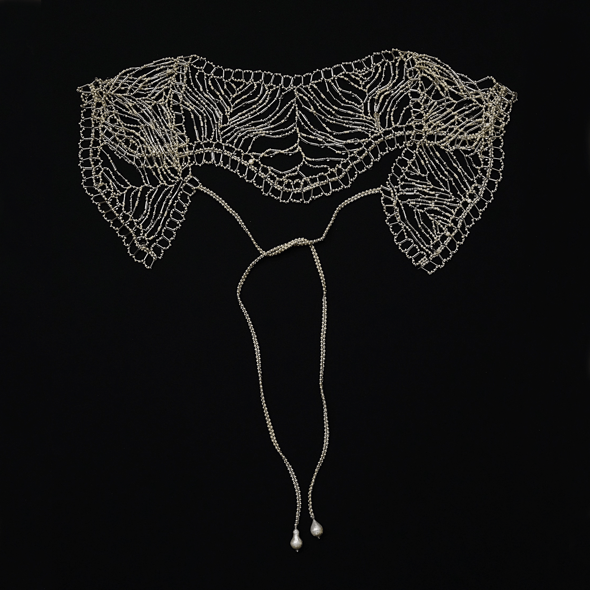- Cuello tejido a mano con hilo blanco, mostacillas, cuarzo cristal y canutillos.
